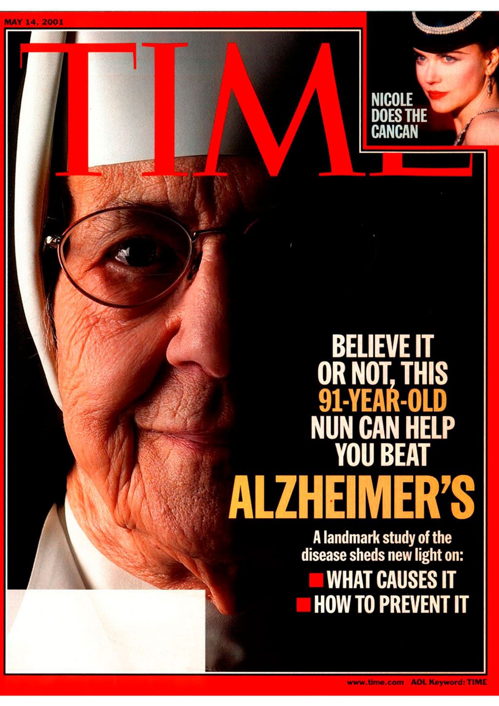 Die Frau auf dem Titelblatt gehörte zur Ordensgemeinschaft « School Sisters of Notre Dame», die im Nordwesten der USA im Bundesstaat Minnesota ein Kloster betreiben. Die Frau war eine von 678 Schwestern, die ab 1986 bei einer Langzeitstudie zu Alzheimer mitmachten – zu dieser Zeit die umfangreichste dieser Art. Sie teilten mit dem US-amerikanischen Wissenschaftler David Snowdon ihre Vergangenheit und Gegenwart, und sie sicherten ihm zu, ihm nach ihrem Tod ihr Hirn zu spenden. Snowdon und sein Team stellten die Frage: Welche Faktoren in der frühen, mittleren und späten Lebensphase erhöhen das Risiko, an Alzheimer zu erkranken? Die Studie ging als «Nonnenstudie» in die Wissenschaftsgeschichte ein und endete im ersten Jahrzehnt des neuen Jahrtausends mit dem Tod der letzten Schwester.