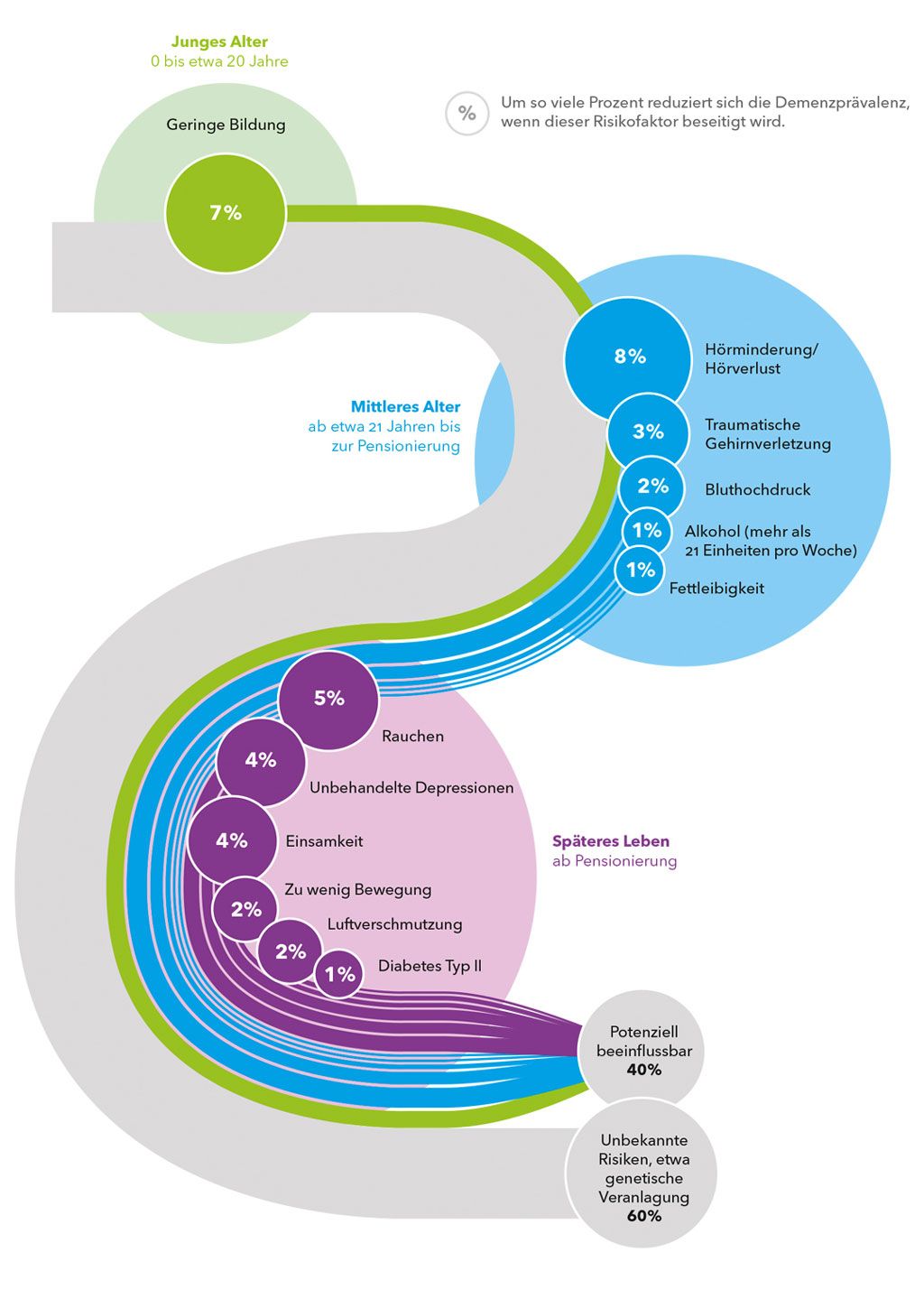 Menschen, die alle Risikofaktoren gut kontrollierten, seien widerstandsfähiger gegenüber Alzheimer. 13 Risikofaktoren können die Wissenschaftlerinnen heute benennen (siehe Grafik). Wer sie in den Griff bekommt, kann den Symptombeginn einer Alzheimer-Krankheit nach hinten verschieben. Manche erlebten ihn dann gar nicht mehr. Und solche, die ungünstige genetische Voraussetzungen hätten, würden zwar erkranken, aber später.