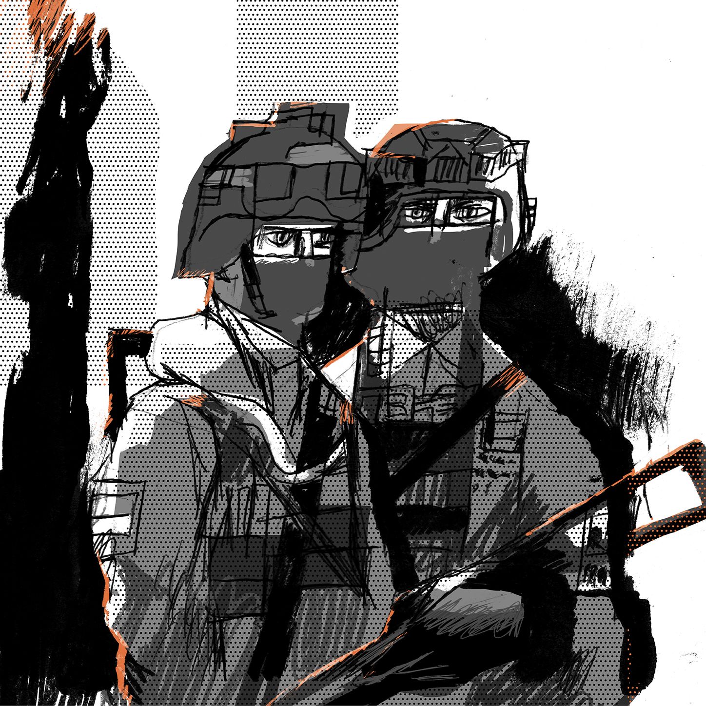 Gewehre, Uniformen, Barrikaden – Sergiy Maidukov zeichnet den Kriegsalltag.