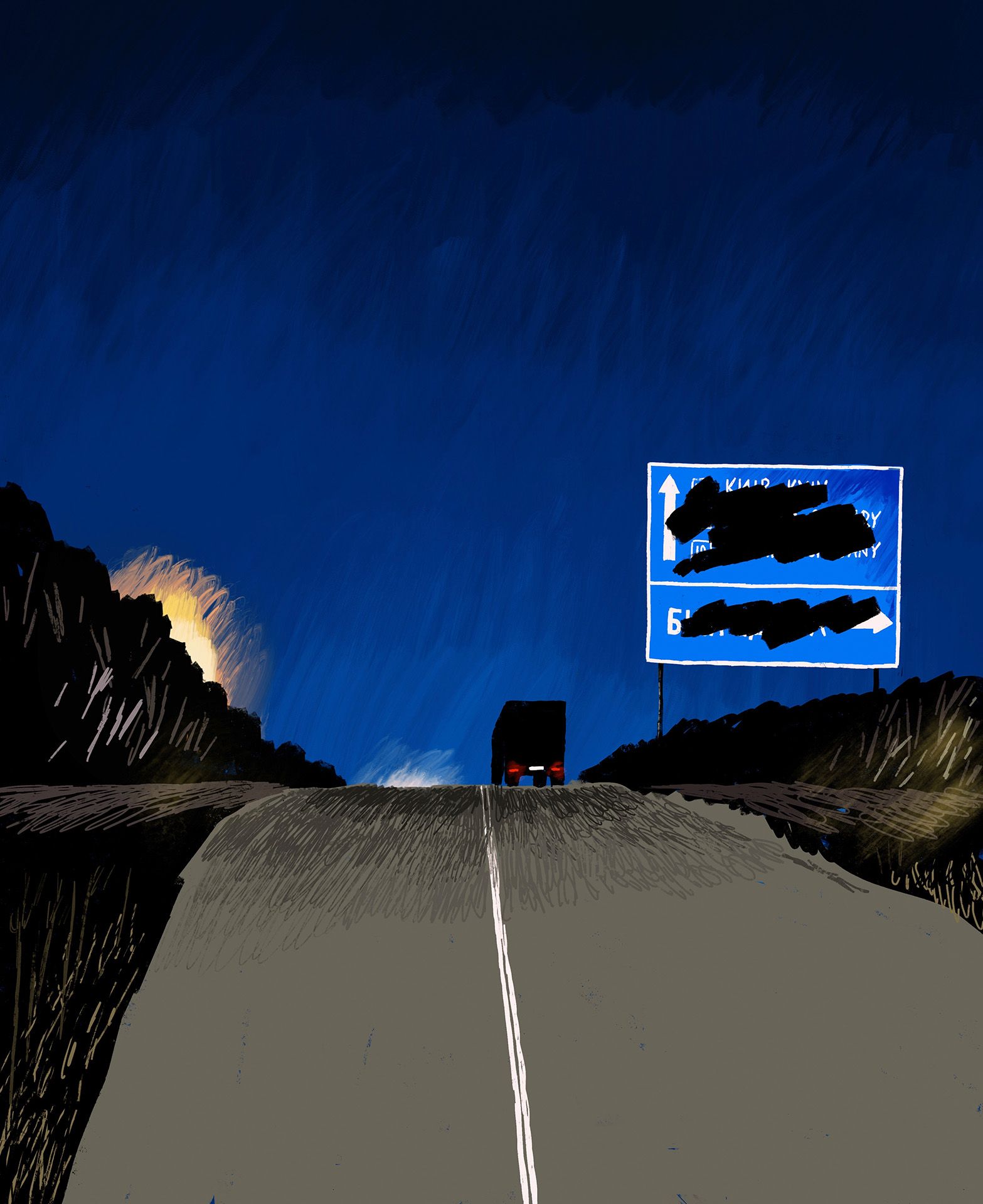 Maidukov war mit dem Auto unterwegs, als sich ganz in der Nähe eine Explosion ereignete. In dem Bild sind entscheidende Details verfremdet – um der russischen Armee keine Informationen zukommen zu lassen