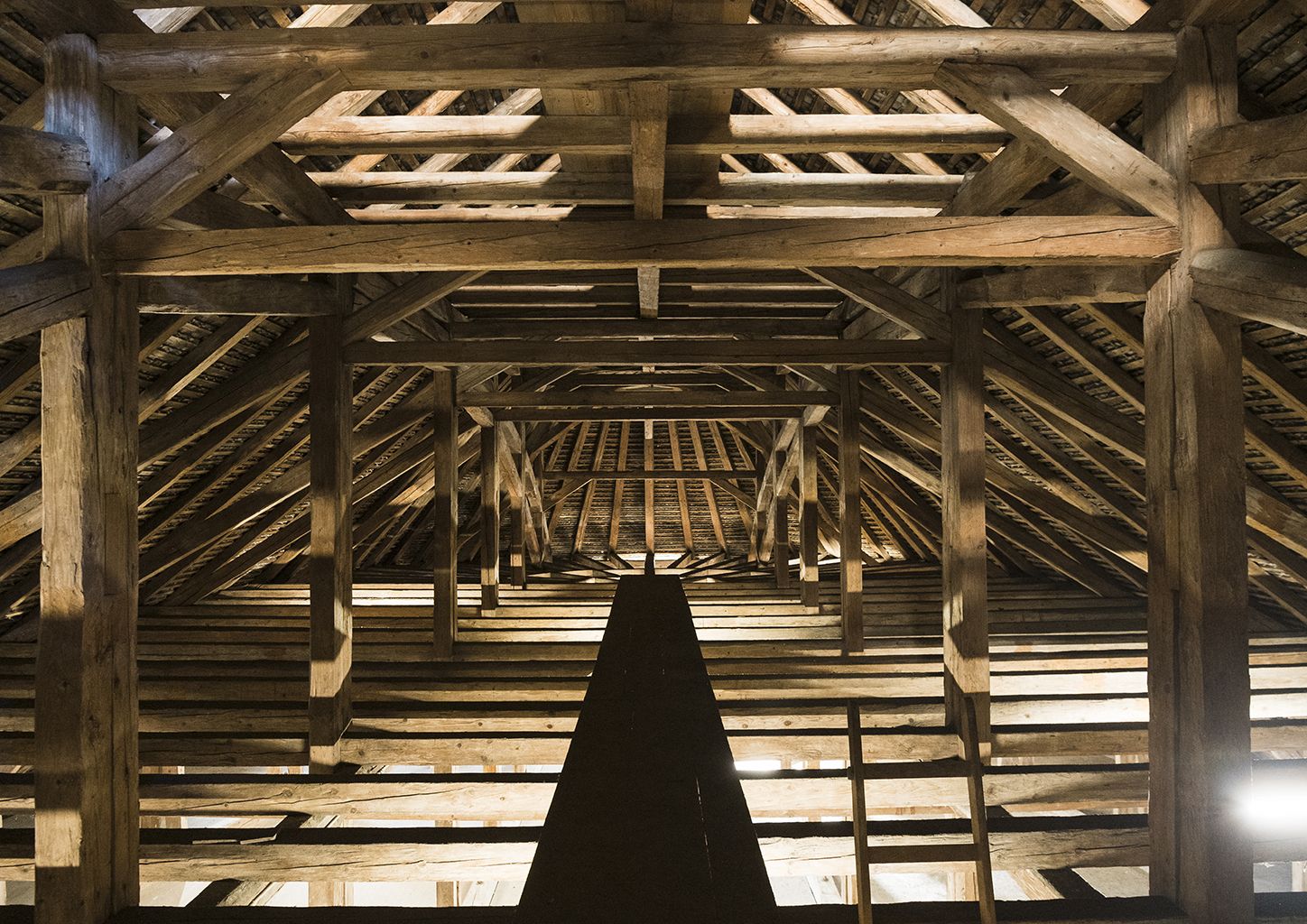 In Horgen steigen nun Jasmin Schäfer und Christoph Sigrist in den Dachstuhl der Kirche. Ihn bekommt kein Gottesdienstbesucher zu Gesicht. Und doch ist er das bautechnische Meisterstück des Gebäudes. Denn nur eine geniale Dachkonstruktion macht es möglich, eine Kirche mit einer Breite von 22 Metern ohne Stützpfeiler zu errichten. «Haltiner hat dafür eine Technik angewendet, die aus dem Brückenbau stammt», erklärt Schäfer. Sie zeigt auf eine doppelt angelegte Parallelkonstruktion, die tatsächlich an eine Brücke erinnert. Jeweils elf bogenförmig aneinander angebrachte Holzbalken überspannen die gesamte Dachlänge von gut 34 Metern. Man nenne diesen Konstruktionstyp Stabpolygon, sagt Schäfer. Die gewölbte Form führt die Lasten des Dachs von der Mitte weg, hinaus auf die stabilen Aussenmauern. In der Querrichtung brachte Haltiner acht doppelte Balken an, die sogenannten Hängewerksbinder. Aufgehängt ist die ganze Konstruktion mit paarweise aufgestellten Hängesäulen.