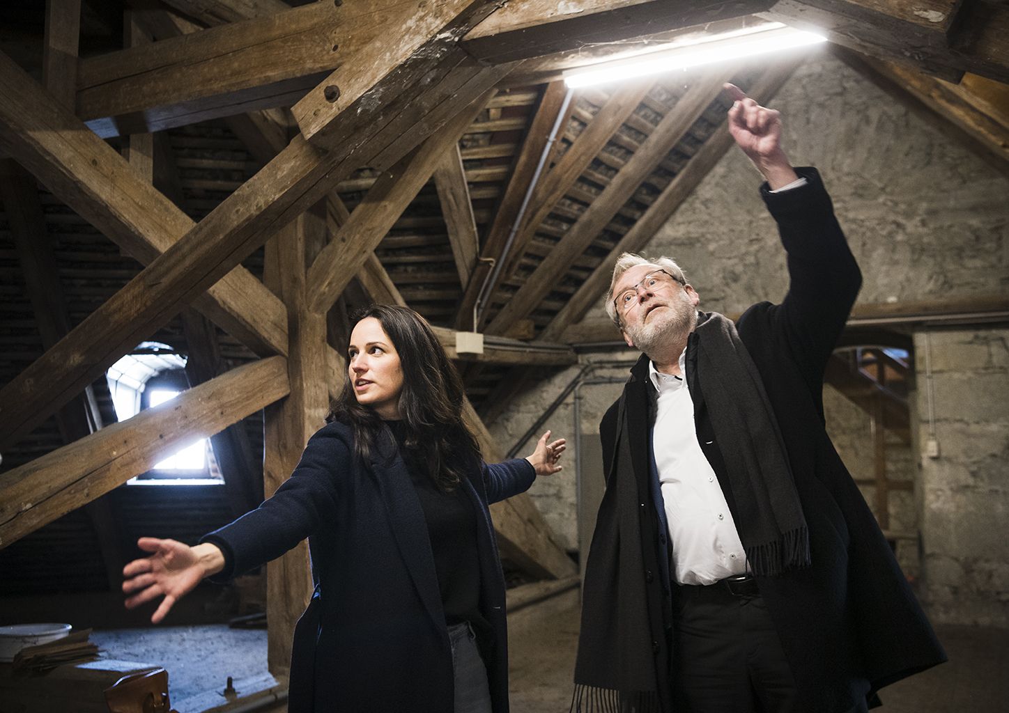 Im Dachstuhl: Christoph Sigrist schaut hoch ins 9,9 Meter hohe Gebälk. Jasmin Schäfer zeigt die Dachlänge an.