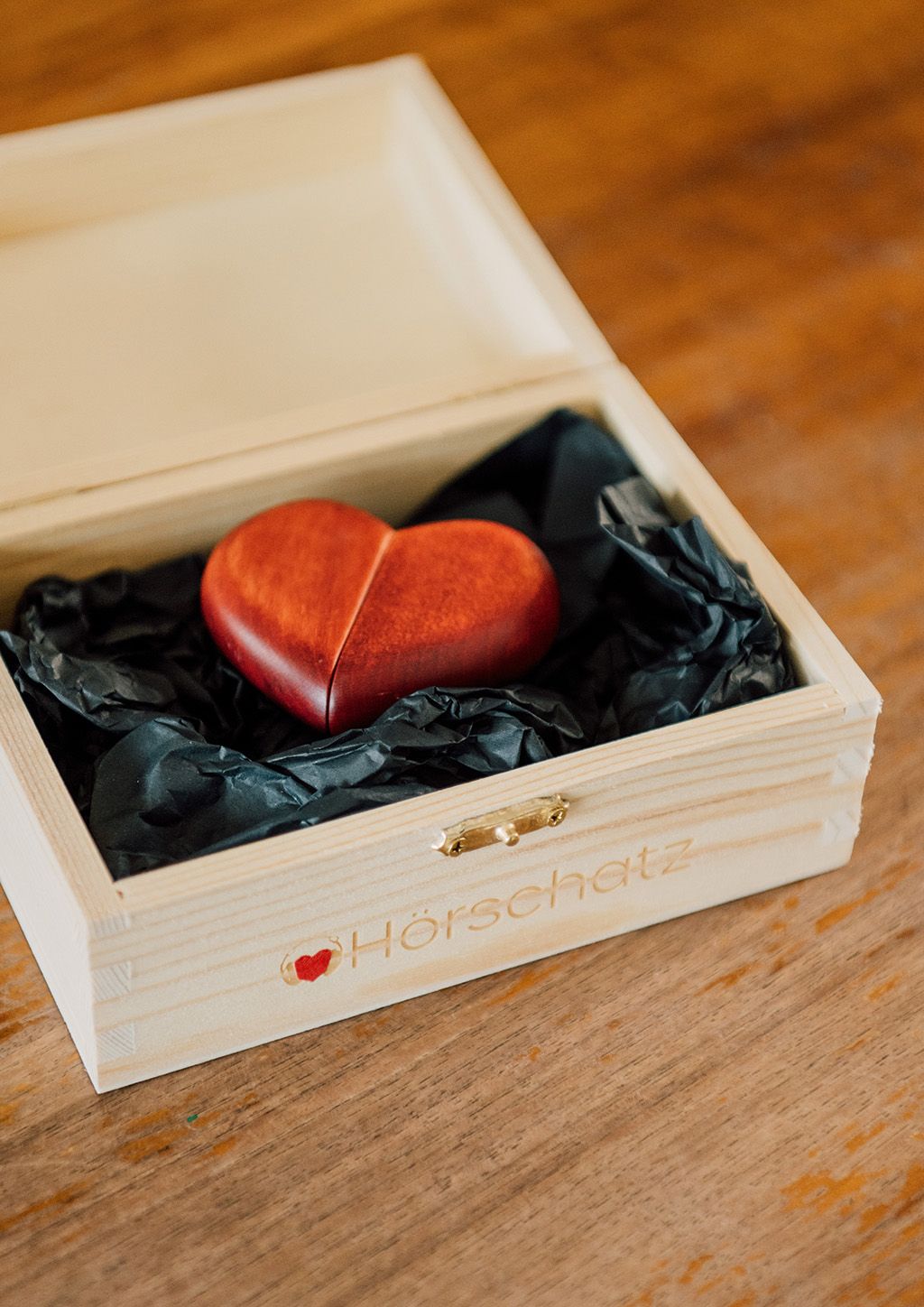 Die Lebensgeschichten der Hörschatz-Mütter und -Väter kommen auf einen USB-Stick in Herzform.