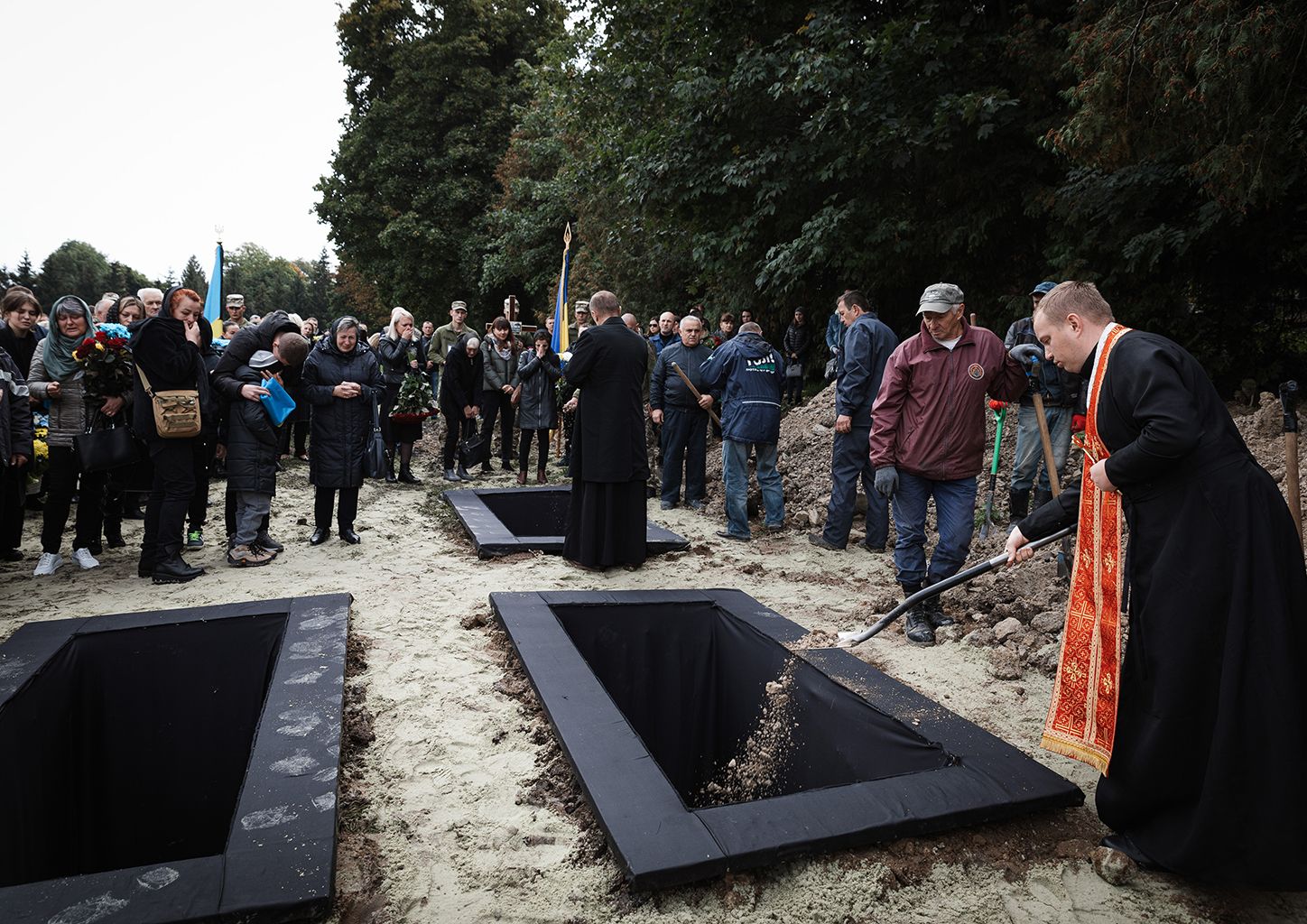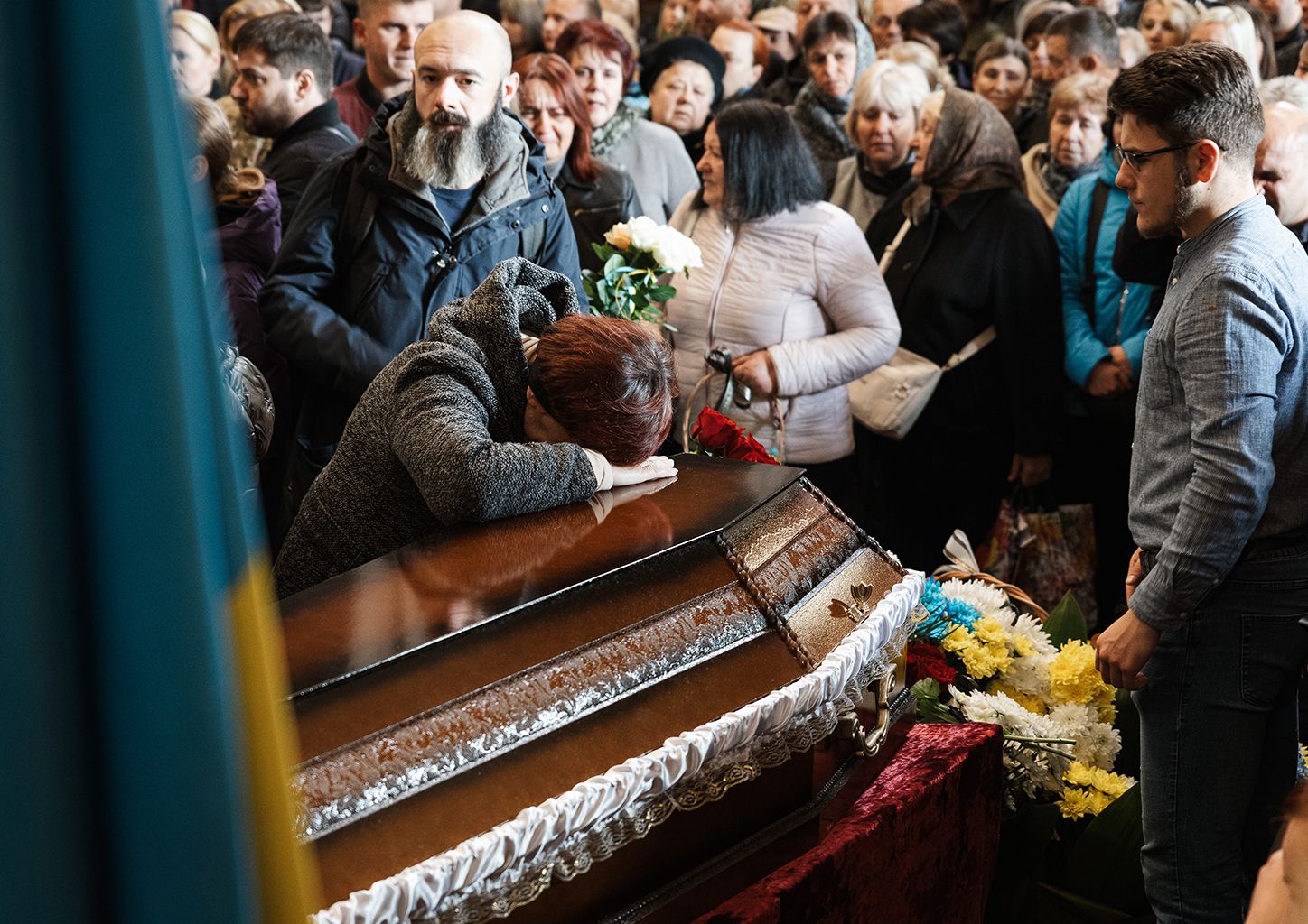 Nestor Ryzyk wendet den vollen Rängen in der Kirche St. Peter und Paul den Rücken zu, er blickt auf die drei Familien, die sich in einem Halbkreis rund um die Särge versammeln. Auf Mütter, Ehefrauen, Freundinnen, Kinder. Ein Junge im Teenageralter wird von seinen Verwandten gestützt, sein Gesicht ist aschfahl. Nestor Ryzyk ist Militärseelsorger, Kaplan, ein Geistlicher mit besonderen Aufgaben. Er betreut Soldaten der ukrainischen Armee. Es sei schwer, die Kinder zu sehen, die sich nie an ihren Vater erinnern werden, wird er später sagen.