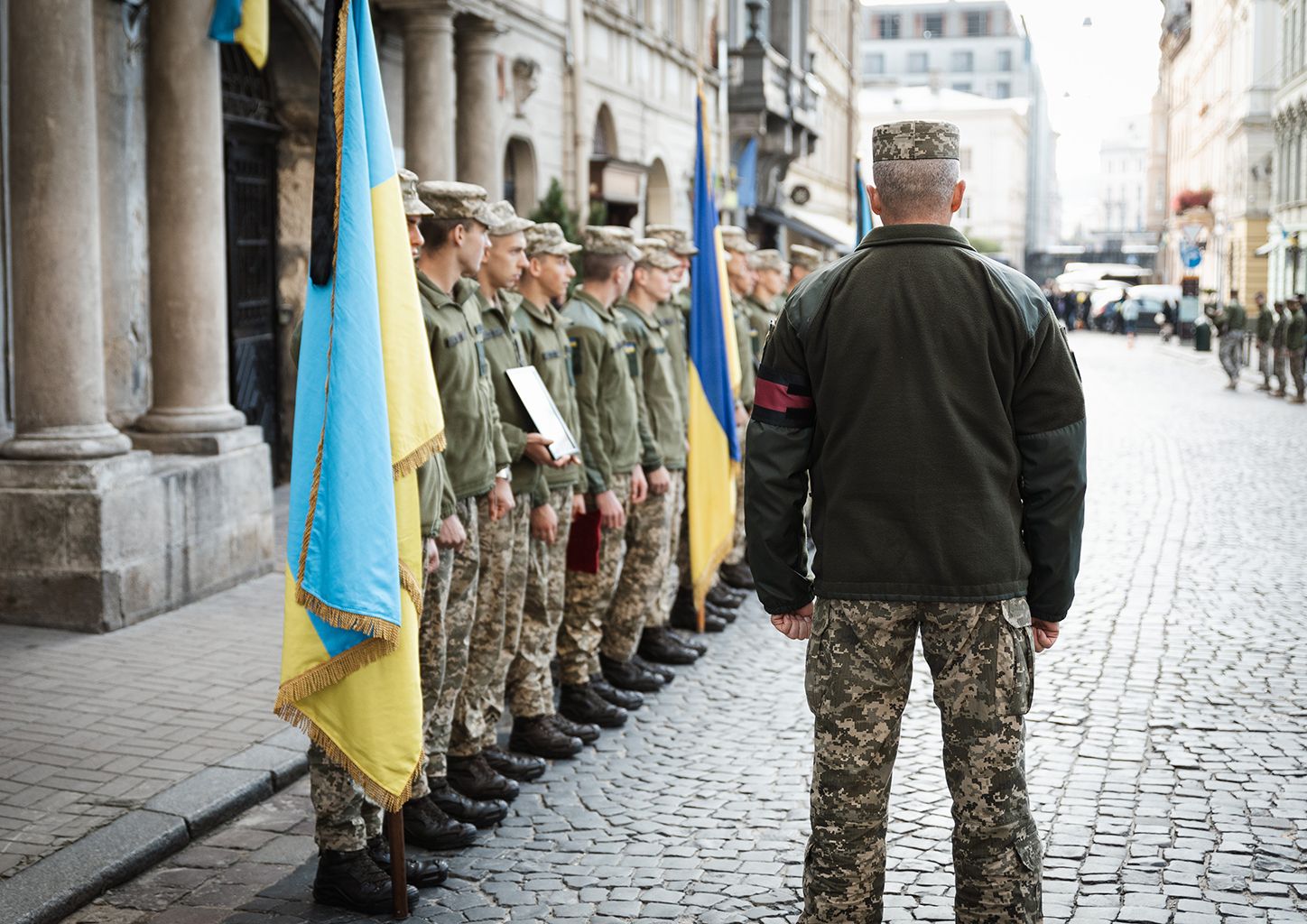 Wenn Serhiy Kubelko von den toten Soldaten spricht, leise und konzentriert, nennt er sie «die Helden». Dabei dreht er einen Bleistift zwischen den Fingern. An der Wand hängt die Fahne eines Panzerbataillons, gelb und blau, darauf ein Panzer und der Schlachtruf: «Es gibt viele Feinde, aber wir sind mehr.» Militärische Durchhalteparolen für die Menschen im Rathaus. Kriegsrhetorik.