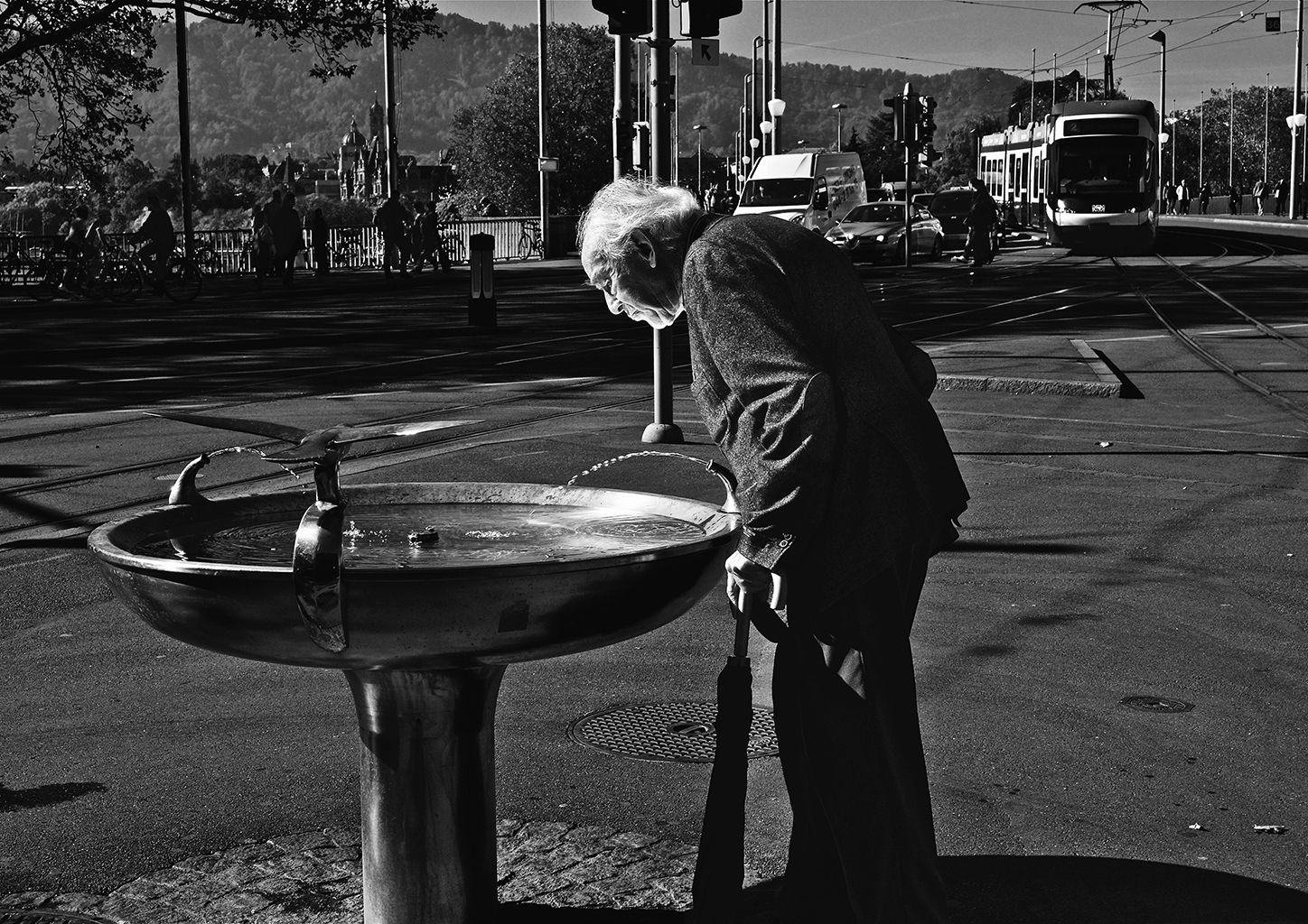 Eine Viertelstunde lang wartete Daniel Comte beim Bellevue, bis ein Flaneur am Brunnen Rast machte, um einen Schluck Wasser zu trinken.