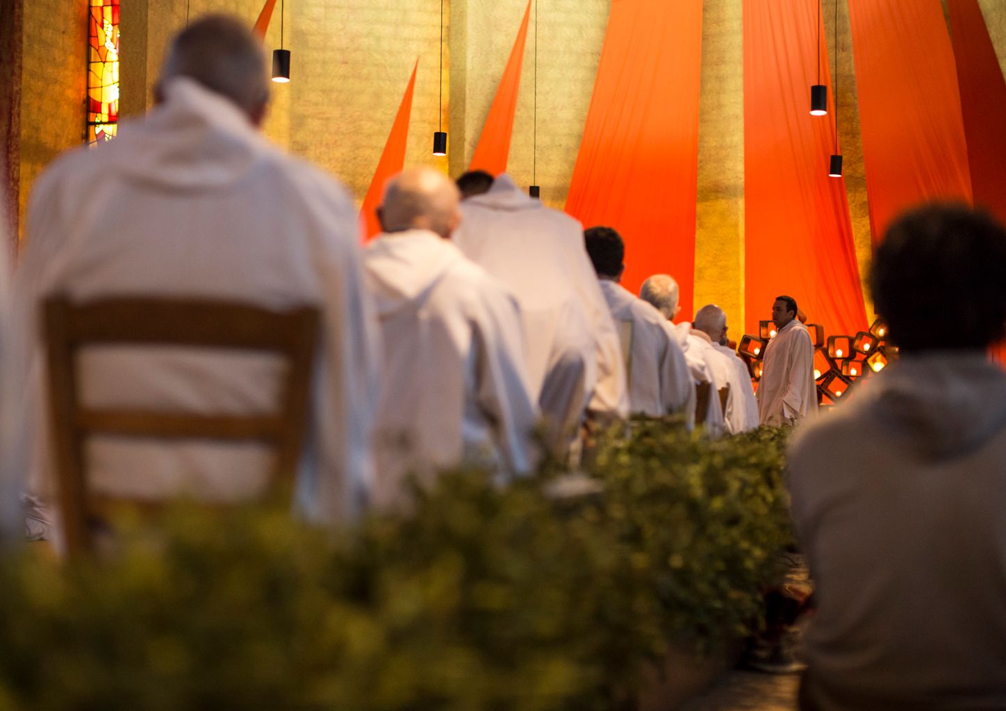 So kennen die meisten Taizé: die Communauté beim Gebet vor den orangefarbenen Segeln, welche die Apsis bilden. Die Gemeinschaft zählt rund 70 Brüder aus 30 Nationen.