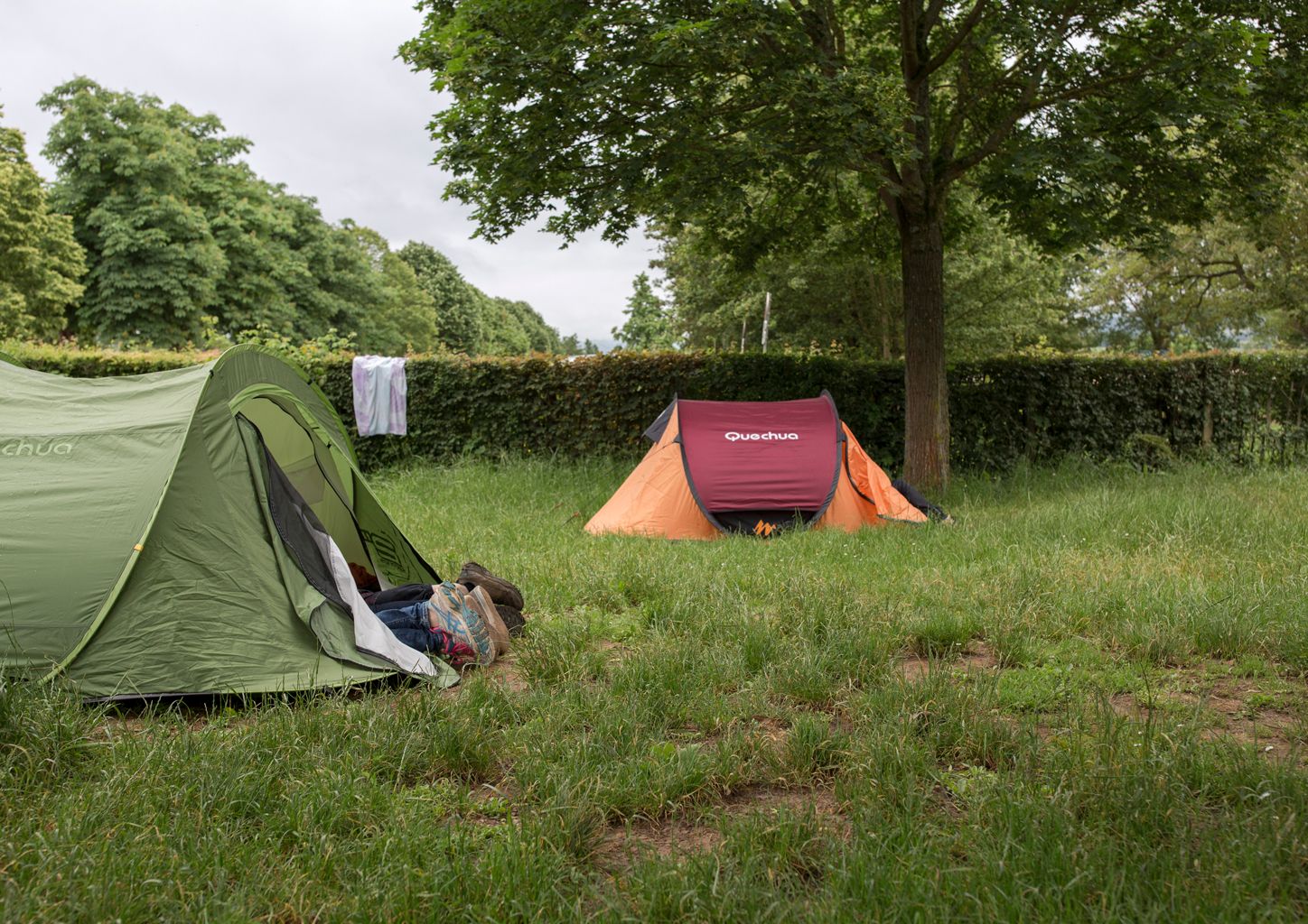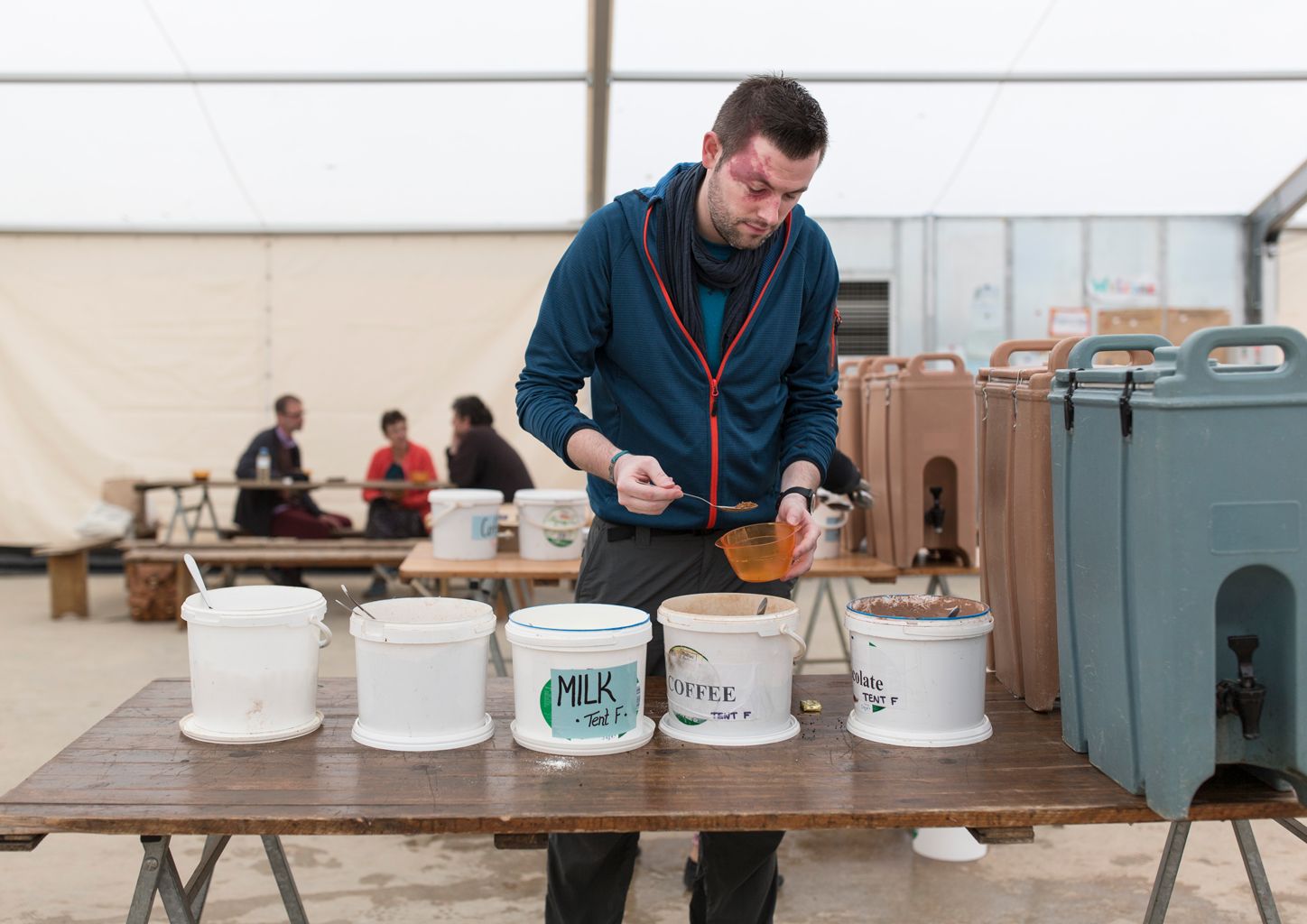 In einem weissen Zelt reihen sich zwei Schlangen vor zwei hölzernen Tischen. Dort walten einige Pilger ihres «Ämtlis» und verteilen Brot und Butter aus grossen Plastikboxen. Konfitüre ist schon alle. Zum Brotstreichen gibt es einen Löffel, zum Trinken heisses Wasser, das man nach Belieben mit Tee-, Kaffee-, Schokoladen- oder Milchpulver anreichern kann. Tische gibt’s fast keine, dafür unzählige Holzbänke. Das Frühstück erweist sich als echte Herausforderung. Die Bank wackelt, und so giesse ich mir die Brühe, die eine heisse Schokolade sein sollte, über die Finger. Wenigstens war das mit dem Heiss ein leeres Versprechen. Und auch beim Butterstreichen mit Löffel bekommen meine Finger definitiv mehr ab als mein Brötchen.