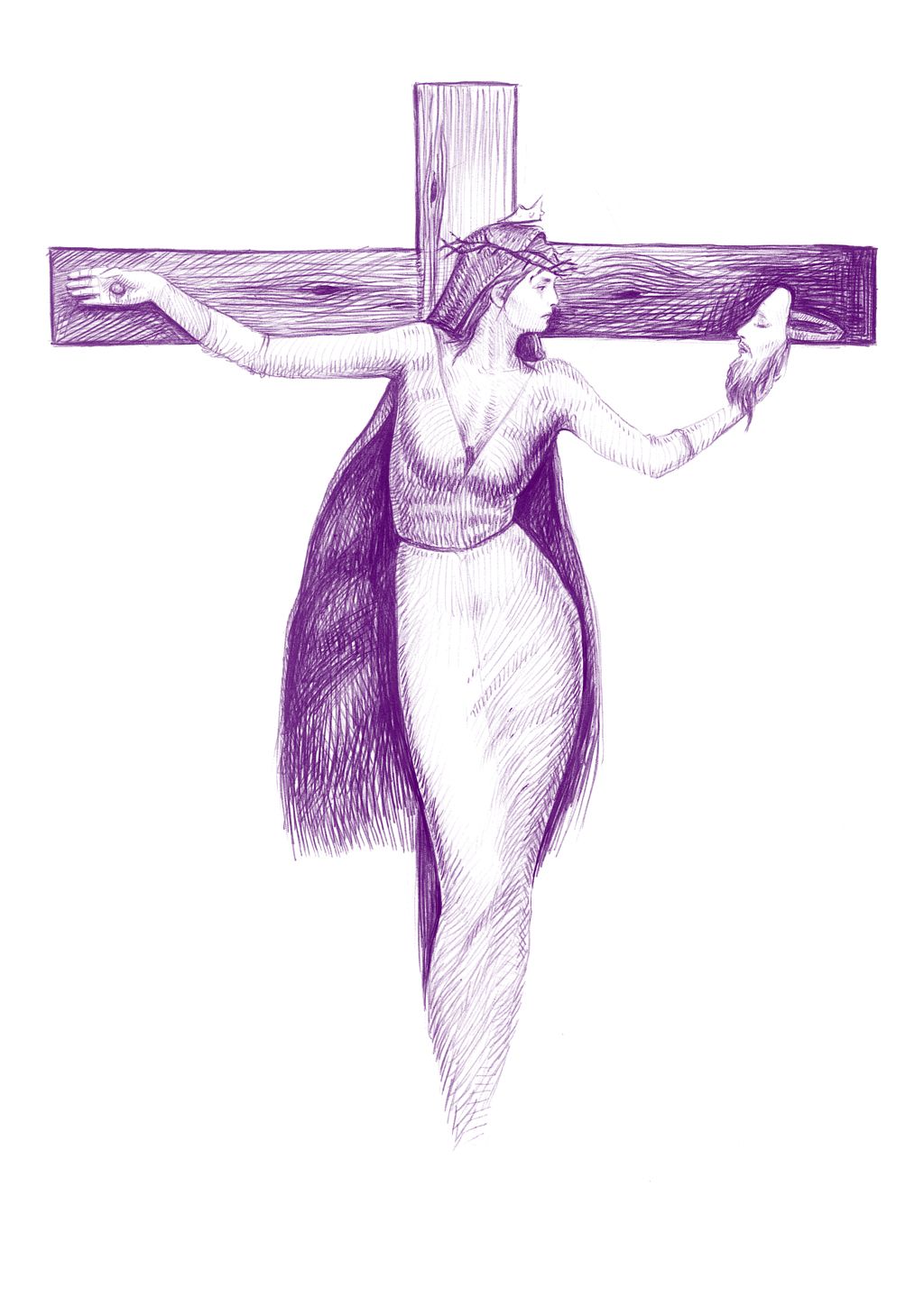 Das hölzerne Kreuz zeigt Jesus als Sieger, er trägt das goldverzierte Gewand, das lange Haar und den Bart eines Hohepriesters. Sein Haupt ziert eine Krone, nur leicht neigt es sich zur Seite, in seinem offenen Blick keine Spur von Leiden. Jesus von Lucca schwebt als der Überwinder des Todes siegesgewiss vor dem Kreuz. Und dann eben dieses kleine Detail: Der Figur ist ein weiblicher Brustansatz zugefügt.