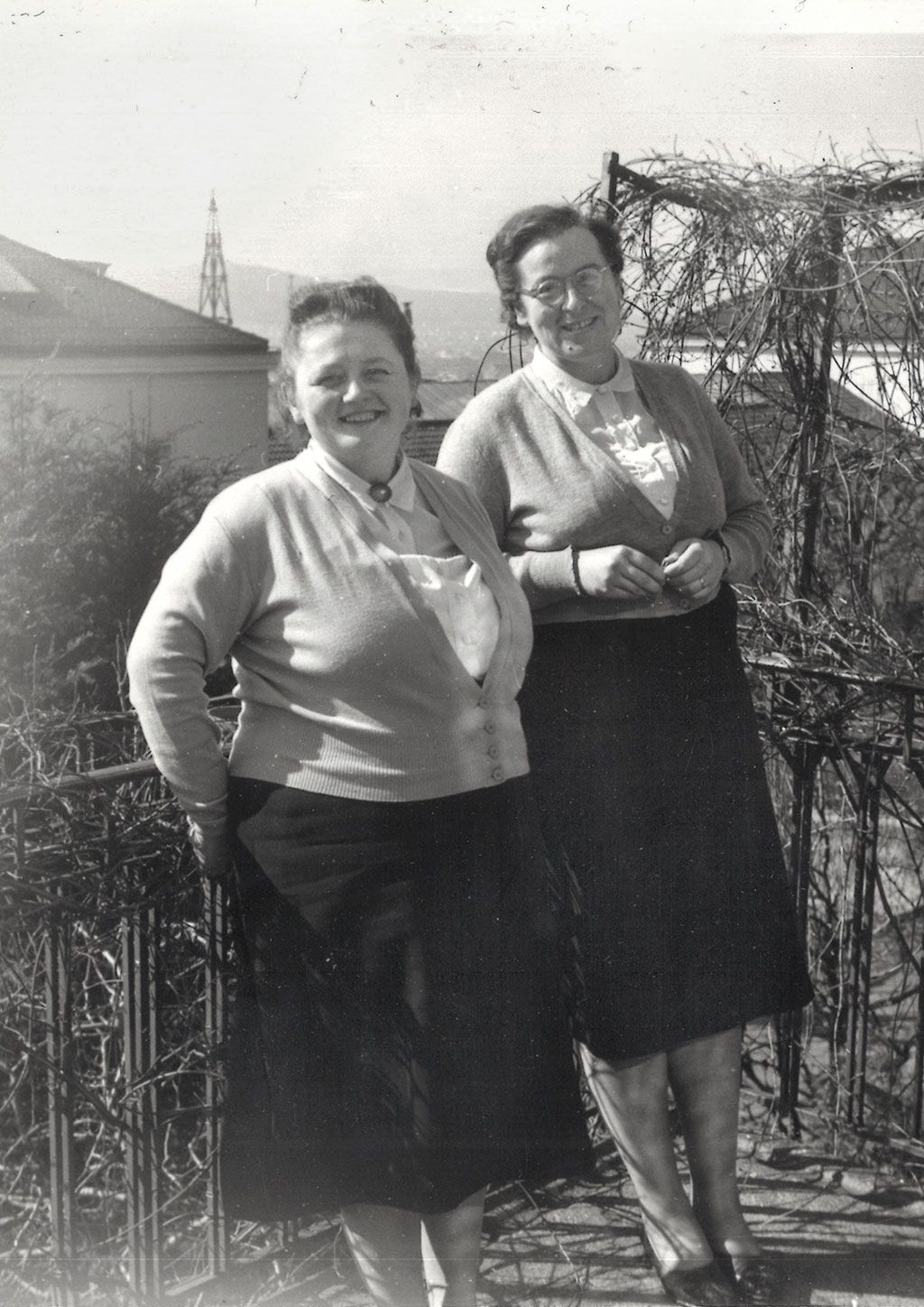 Else Kähler und Marga Bührig auf dem Balkon des Studentinnenhauses an der Voltastrasse, um 1955.