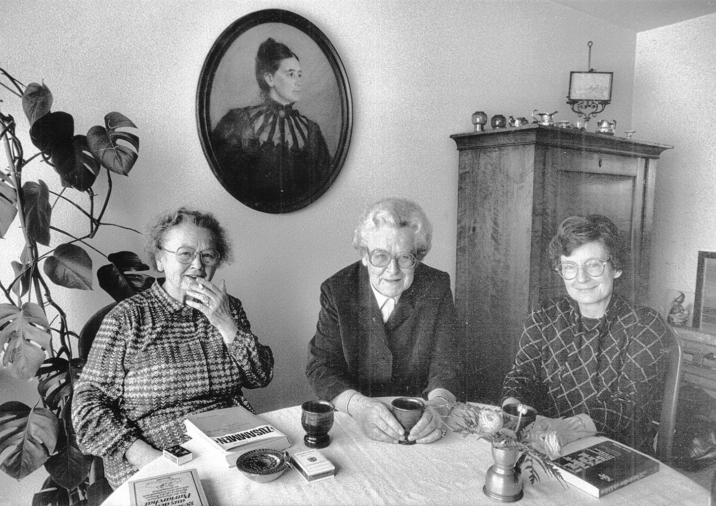 Else Kähler, Marga Bührig und Elsi Arnold in ihrem Haus in Binningen, 1987.