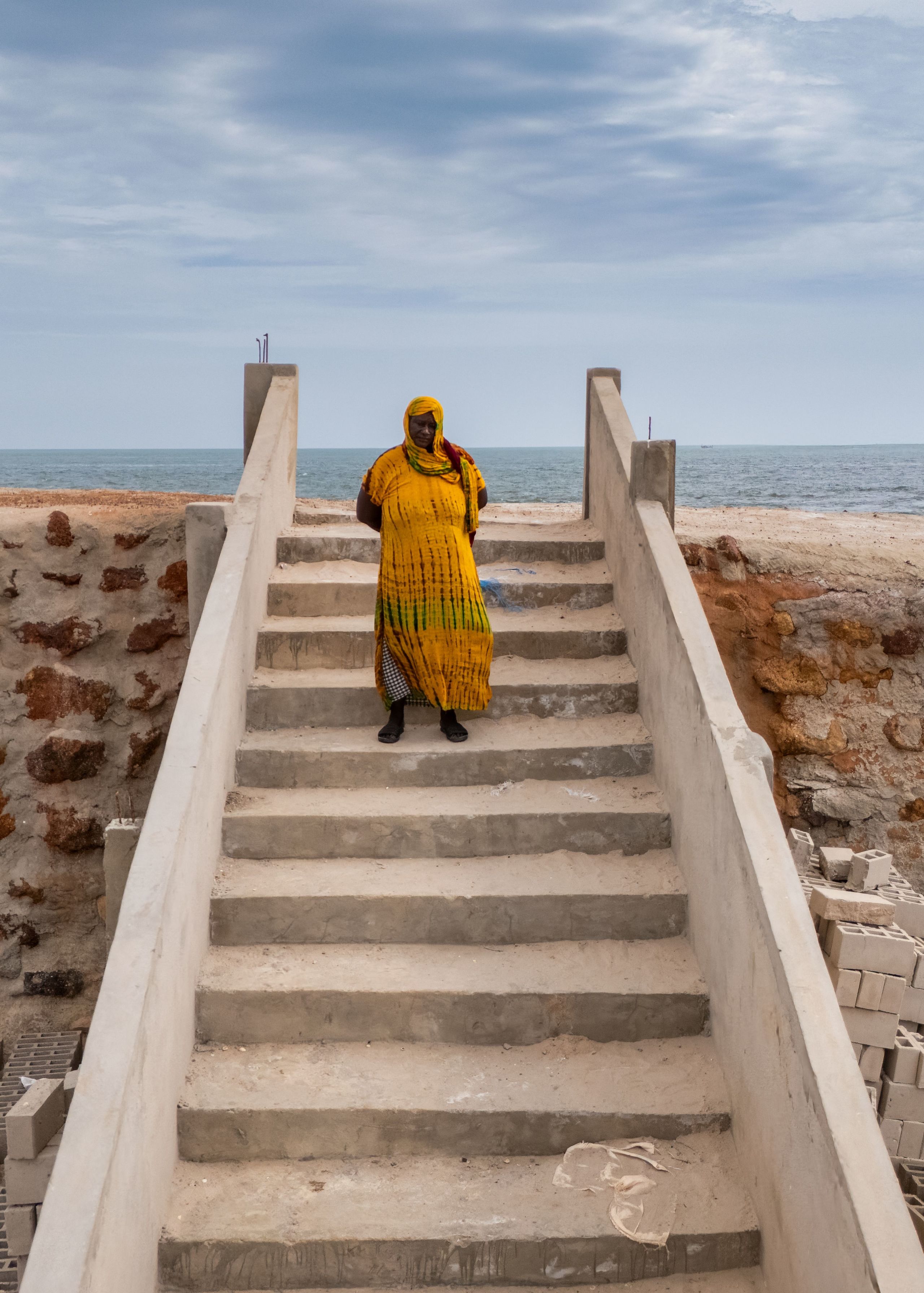 Aus dem Zement, den Abdoullaye gerade abfüllt, entstehen Bausteine, mit denen im Schutz der Mauer wieder Häuser gebaut werden sollen, in Sicherheit vor dem Meer. Sophie hat sich auf die unterste Stufe einer Treppe gesetzt, die auf die Mauerkrone führt. «Es ist unvorstellbar für mich, wieder hier zu wohnen», sagt sie und seufzt. Sie hadert sichtlich. Es ist nicht nur die Hitze, die ihr zu schaffen macht.