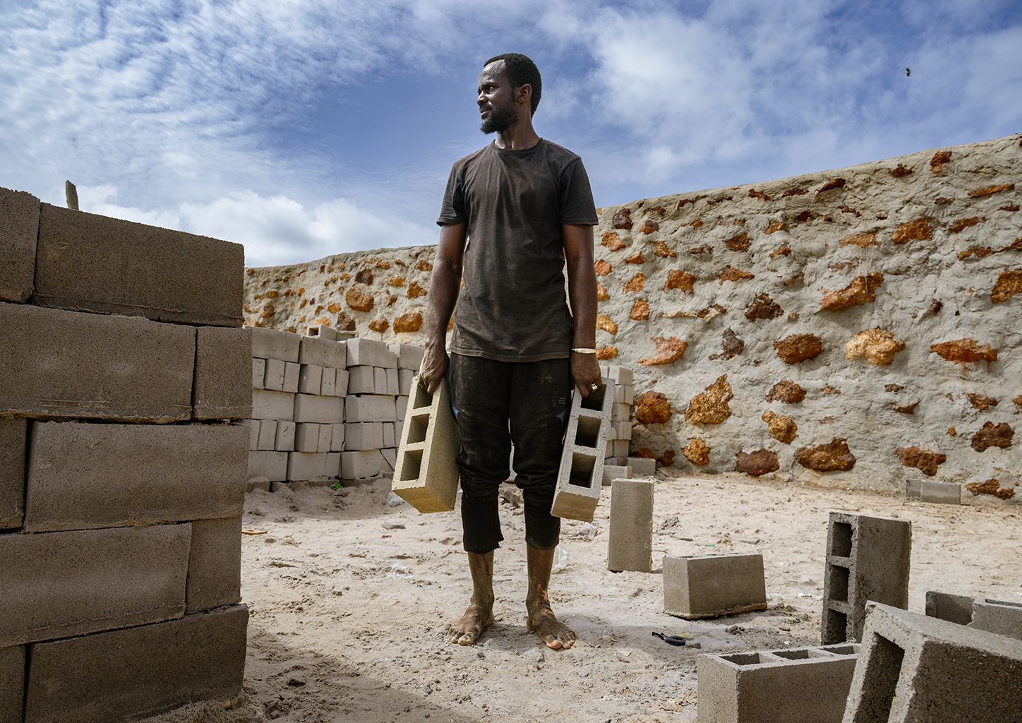 Abdoullaye Yakhine Babou stellt in Djiffer Zementbausteine her. Mit ihnen sollen im Schutz der Mauer neue Häuser gebaut werden.