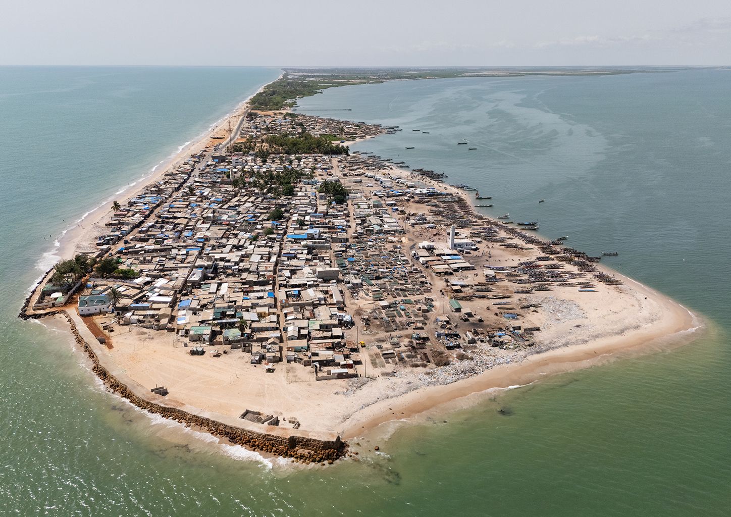 Vielleicht wird es Djiffer, gelegen auf einer schmalen Landzunge, bald nicht mehr geben. Links unten ist die Mauer zu sehen, welche die Bevölkerung zum Schutz vor den Fluten baut.