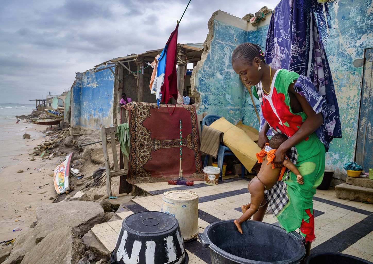 Im Dorf Bargny badet eine Frau ihr Kind in den Überresten ihres Hauses. Den anderen Teil hat das Meer verschluckt.
