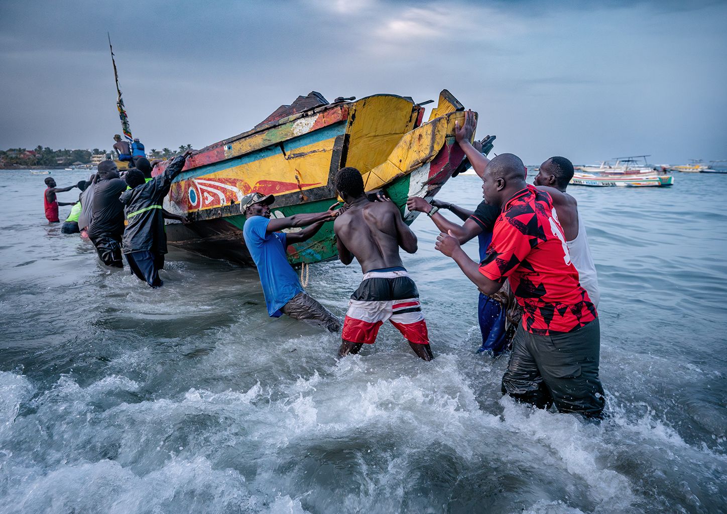Bewohner von Ngor schieben ein Fischerboot ins Meer, um es dort zu verankern. Rund 80 Personen hatten damit flüchten wollen, der Versuch scheiterte aber wegen des Wetters.