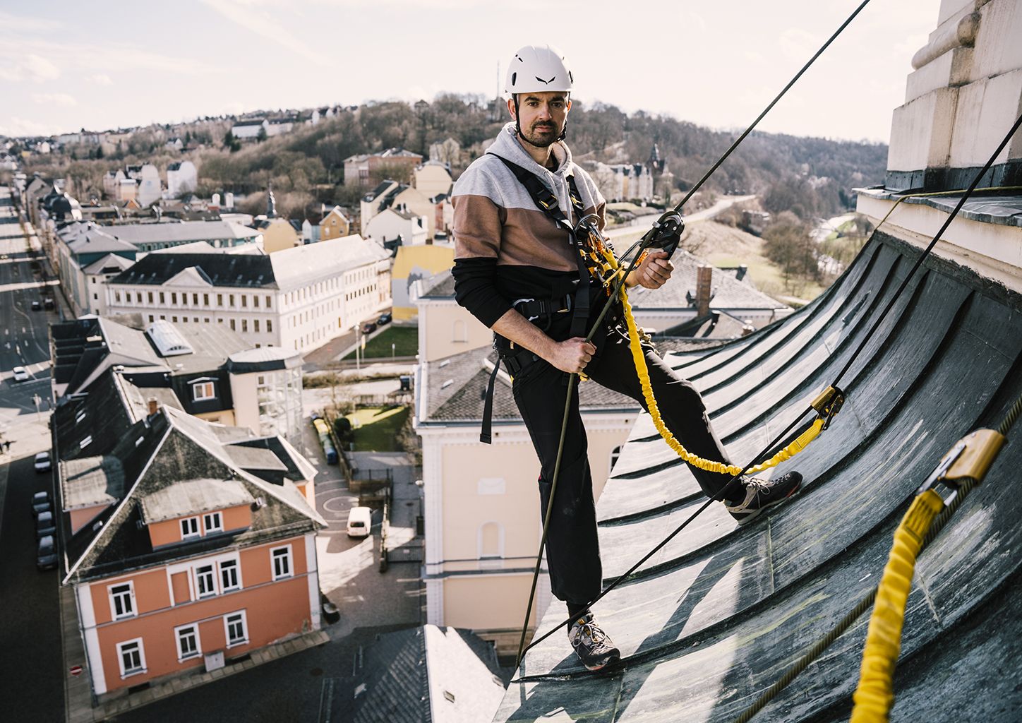Gemeindepädagoge Christian Mende greift gleich selber zur Kletterausrüstung, wenn es am Kirchturm ein Banner zu befestigen gilt.