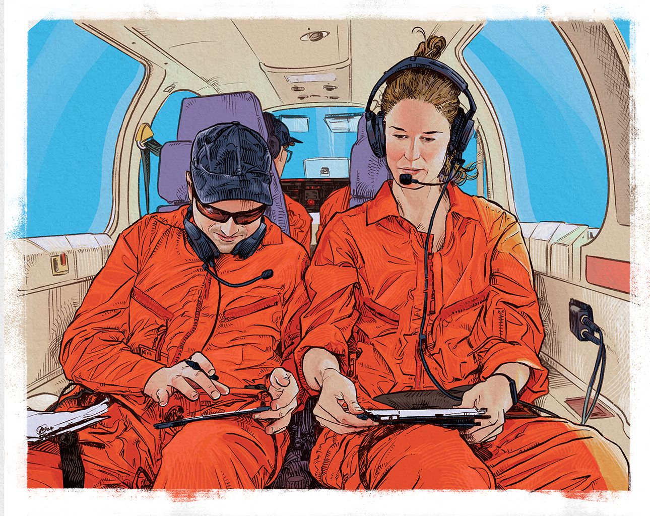 Im hinteren Teil nehmen Eike und Sasha Platz. Eike aus Deutschland ist heute der Tactical Coordinator, die US-Amerikanerin Sasha durchläuft gerade das Training. Der Tactical Coordinator entscheidet grundsätzlich über die Flugroute und verantwortet die Kommunikation via Funk. Alles, was die Technik und das Fliegen betrifft, liegt in der Verantwortung des Piloten. Sasha hatte bei HPI zunächst als Spotterin angefangen – so werden die Mitfliegenden genannt, die unablässig mit Ferngläsern das Meer absuchen. Auch ich muss heute spotten, schliesslich nehme ich einem aufmerksamen Augenpaar den Platz weg.