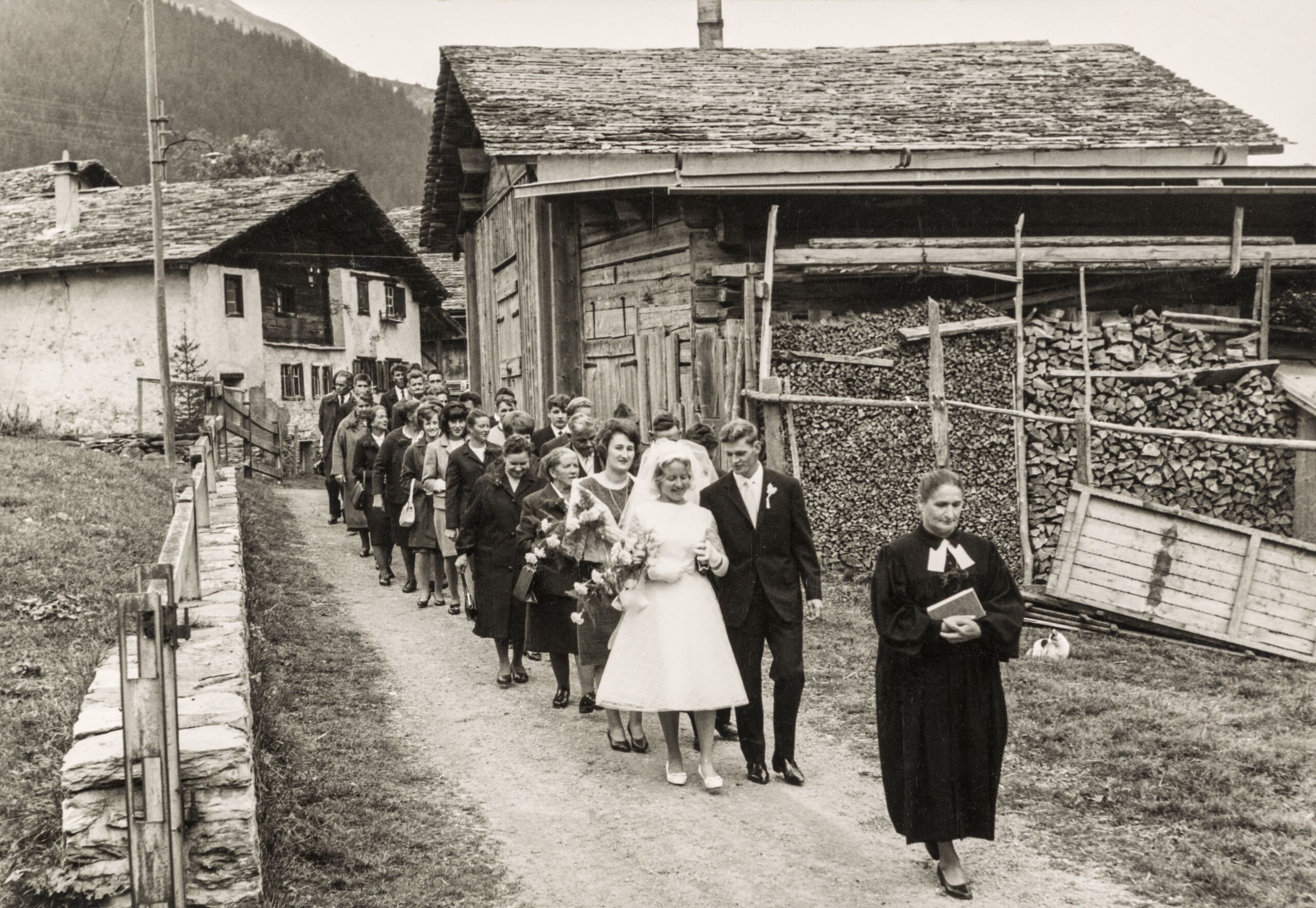Pfarrerin Greti Caprez-Roffler 1966, an der Spitze einer Hochzeitsgesellschaft im Bündner Bergdorf Nufenen.
