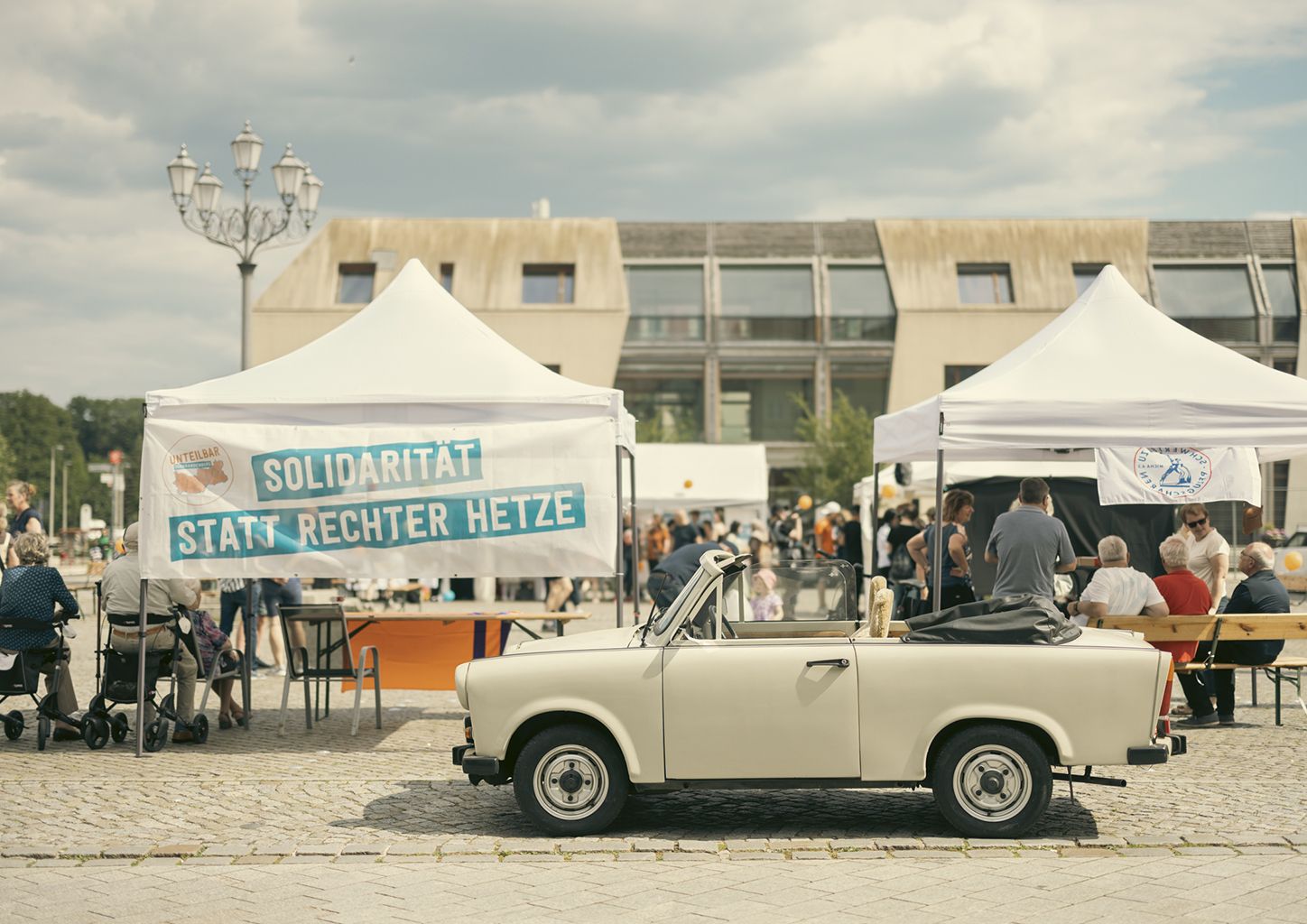 Ein Trabi parkt vor dem Marktplatz, im Hintergrund sind Pavillons des Unteilbar-Festes zu sehen.