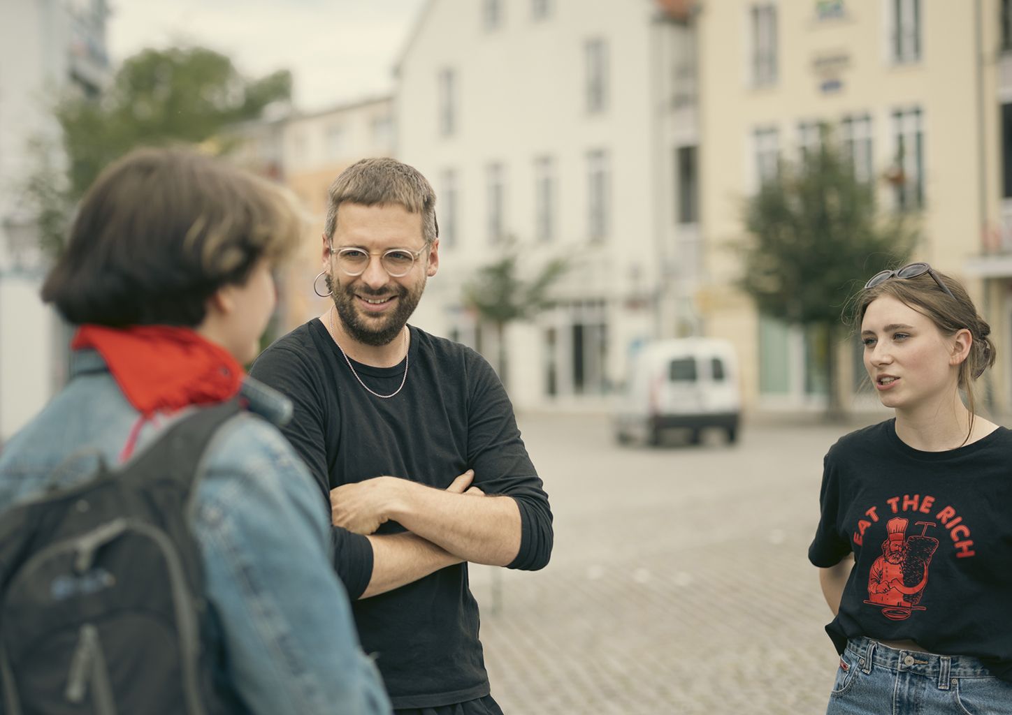 Lukas Pellio im Gespräch mit Mitstreiterinnen des Unteilbar-Bündnisses.