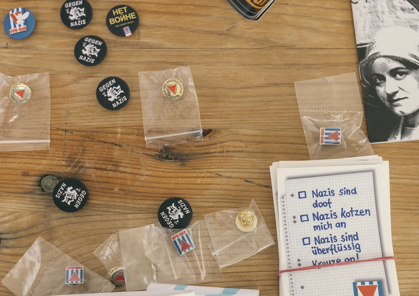 Mit Buttons, Pins und Kärtchen gegen Rechts – ein Stand auf dem Marktplatz von Spremberg.