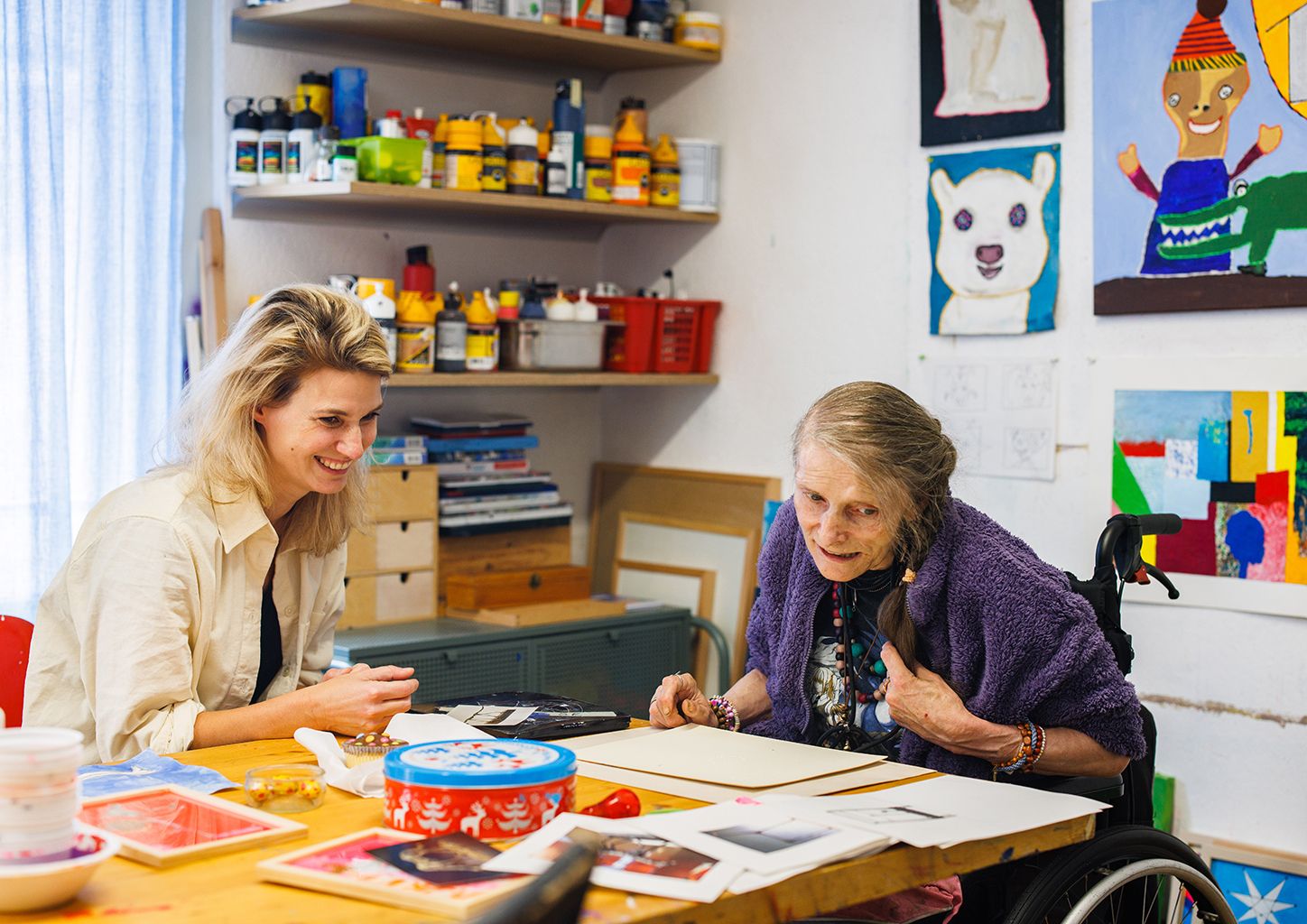 Friederike Rass im Malatelier des Sune-Egge. Mit Künstlerin Pascale spricht sie über Treffpunkte für Obdachlose, Dialekte und ihr eigenes, eher bescheidenes Zeichentalent.
