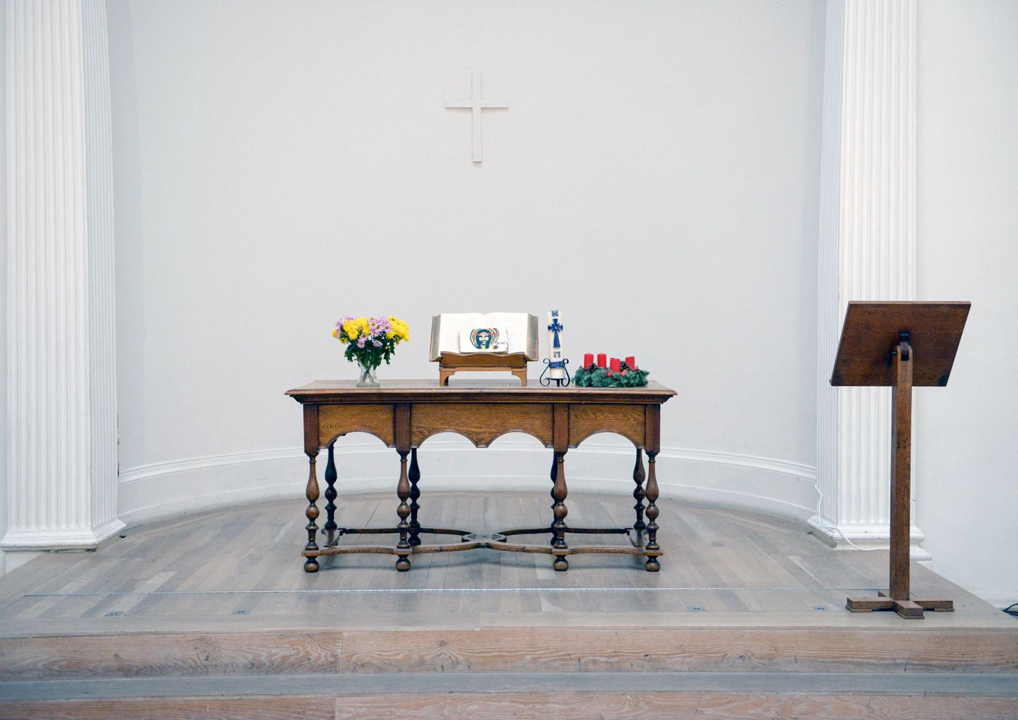 Zwei Tage später, der Sonntagsgottesdienst nach dem Diner. Die Tische und die Videoinstallation sind zur Seite gestellt, ein paar Stuhlreihen stehen verloren vor dem Altar. Darüber, an der Wand, das in Weiss getauchte Kreuz. Gleich in gleich mit der Wandfarbe, fast unsichtbar. Wer es nicht sehen mag, sieht es nicht.