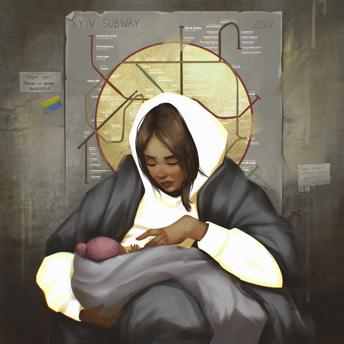 Als das Bild der «Madonna von Kiew», wie sie mittlerweile genannt wird, in den sozialen Netzwerken auftauchte, war ich deshalb unweigerlich berührt. Auf dem Foto sieht man eine Frau, die in der Kiewer Metro Schutz gesucht hat. Eingewickelt in dicke Decken, stillt sie ihr Baby. Dabei strahlt sie Ruhe aus, beinahe Zufriedenheit. So, als ob für einen kurzen Moment alles um sie herum …