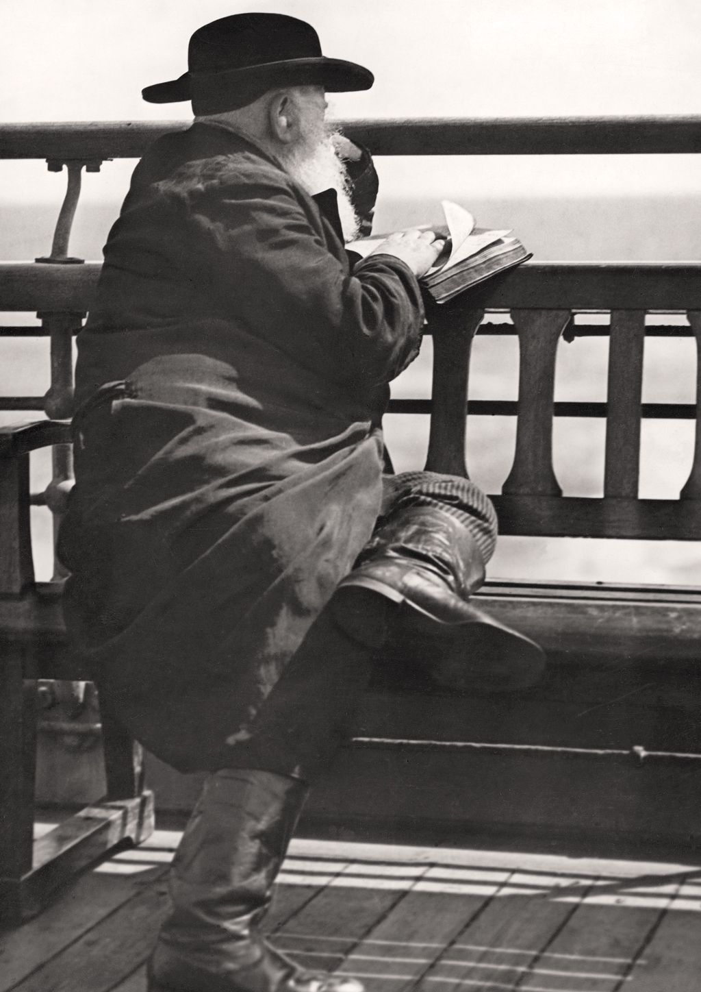 Das ist ein ungeheures Bild, weil es so deutungsoffen ist. Zu sehen ist ein offenkundig jüdischer Auswanderer. Er hat ein Buch in der Hand, vielleicht die Bibel oder den Talmud, so würde ich das deuten. Er nimmt es mit auf seine Reise, es ist sein Wanderbuch. Der alte Mann schaut aber nicht hinein, sondern er schaut hinaus, auf den Horizont, dahin, wo er hinfährt. Dies ist für mich das wichtigste Foto im ganzen Buch, weil es zeigt, dass die Bibel ein Wanderbuch ist, das mitgenommen wurde. Ein Buch, in das die Erfahrung von ihm und vielen, vielen Vorfahren eingeschrieben ist. Ihr Glaube ist in der Heimatlosigkeit entstanden und musste sich in der Heimatlosigkeit bewähren. Und trotzdem ist die Zukunft dieses alten Mannes offen. Ich hoffe, er ist gut angekommen.