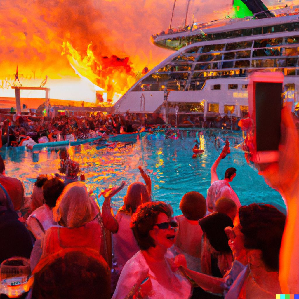Verwendete Stichwörter: people partying on a large luxury cruise ship, several floors and swimming pools, wildfires in the background, a person with a drink taking a selfie
