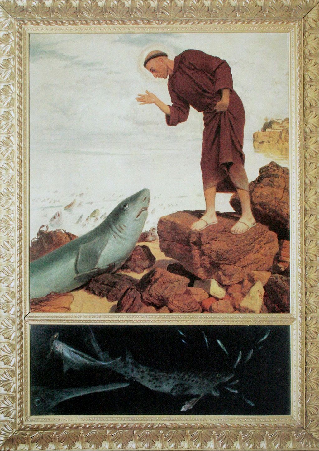 Zu Tausenden sollen die Fische an den Strand herangeschwommen sein. Arnold Böcklin malte die Fischpredigt ganz nach der Erzählung, poetisch und phantasievoll. Wäre da nur nicht das kleine Bild, dass er untrennbar unter die heile Szene platziert hat. Auf diesem ist zu sehen, was sich unter der Wasseroberfläche ereignet: In dunkler Tiefe sind die schönen Lichtreflexe der Fischleiber zu sehen, aber auch ein Hecht, der kleine Fische jagt und verschlingt. Es ist dieses Sockelbild, dass die Moral des Gesamtwerks rahmt: Andächtig lauschen wir dem Guten, um danach wieder in die Tiefe und Dunkelheit abzutauchen. Zurück ins alte Leben, zurück zu den bösen Gewohnheiten.