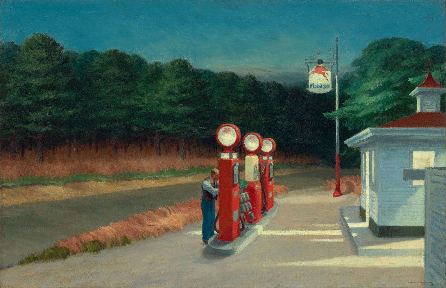 Hoppers Bild verwies schon 1940, lange vor der Erkenntnis, dass wir für unsere Mobilität einen viel zu hohen Preis bezahlen, darauf hin, dass der Horizont am Ende der Landstrasse nicht blau ist, sondern schwarz. Und doch geht das Bild weit über die Diagnose sozioökonomischer und ökologischer Gegebenheiten hinaus. Nicht nur die Tanksäulen leuchten, sondern auch das Gras am Strassenrand und der Wald scheinen aus sich heraus zu leuchten. Als sei da etwas im Dickicht verborgen, an dem man schnell vorbeirasen kann mit dem Fuss auf dem Gaspedal, das aber auch geheimnisvoll lockt, wie der Wald im Märchen.