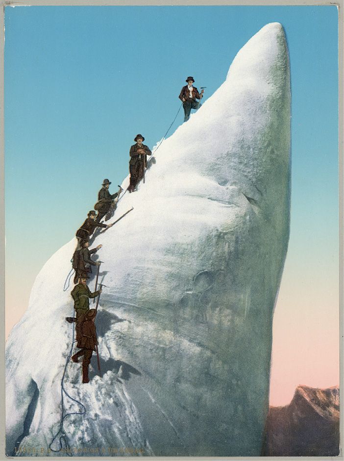 Bild: «Besteigung eines Sérac», Autor unbekannt, Postkarte Photoglob-Wehrli, entstanden um 1900. Original im Bestand der Schweizerischen Nationalbibliothek.