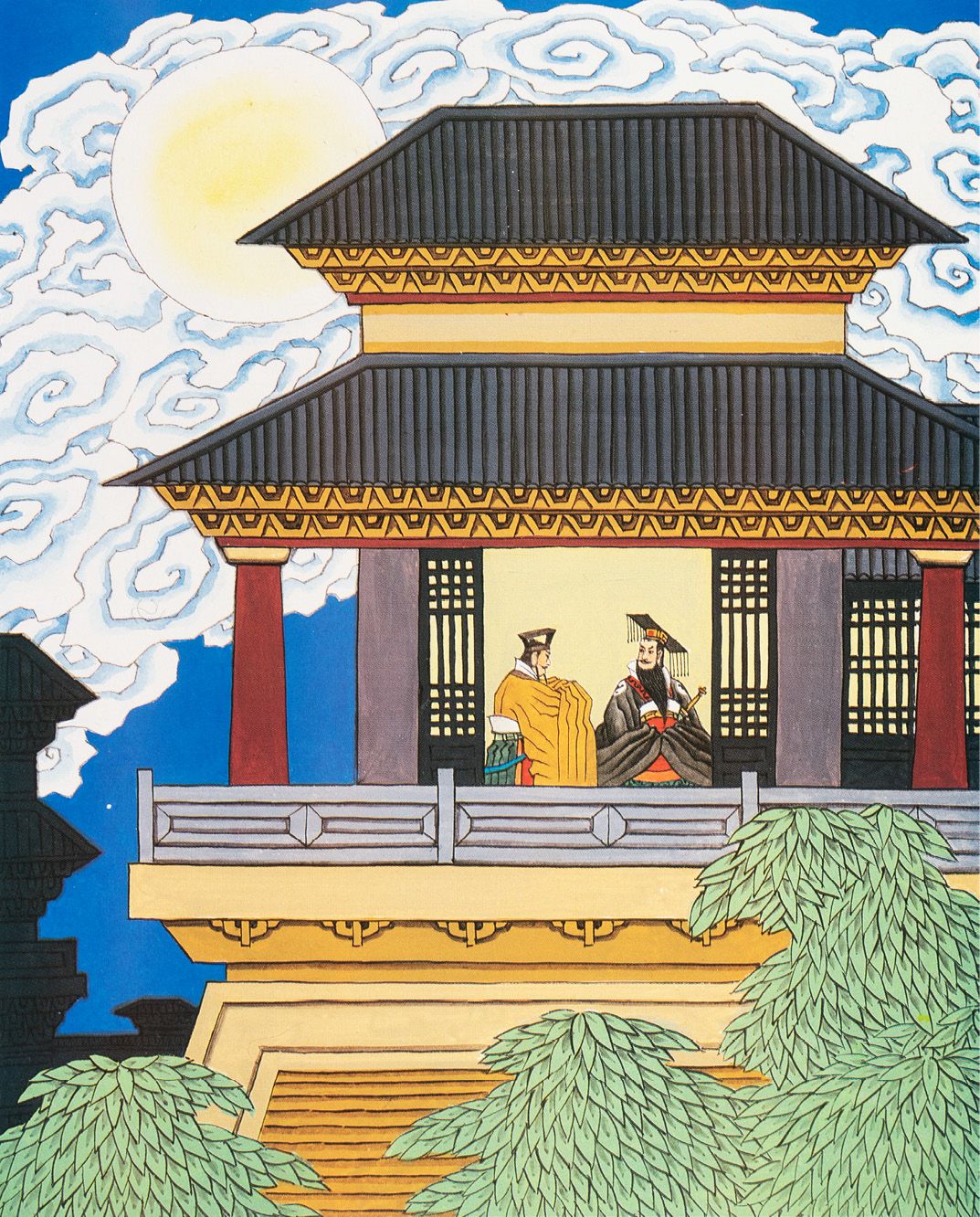 Um solch eine List geht es auf dieser Illustration des Künstlers Li Yuanye. Sie zeigt eine Episode aus der Zeit der Streitenden Reiche um etwa 350 vor Christus. Huiwen, der König des Staates Qin, wird von seinem Berater Zhang Yi davon überzeugt, nicht mit Waffengewalt, sondern mit List eine feindliche Allianz zwischen den Staaten Qi und Chu zu brechen. König Huiwen ist begeistert. Darauf begibt sich Zhang Yi an den Hof des Königs von Chu.