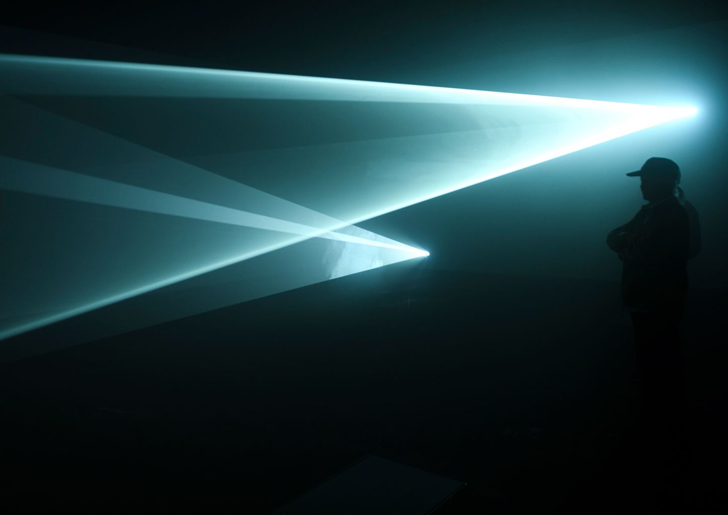 Zu Hause las ich nach: Anthony McCall beschäftigt sich in seinen Installationen seit den 1970er Jahren mit der Idee des Solid Light. Dabei bezieht er sich auf die Effekte, die durch eine sorg- fältig ausgerichtete Projektion von Lichtebenen im Raum erzeugt werden. So entstehen diese Lichtformen, die wirken, als wären sie etwas Festes, Materielles.