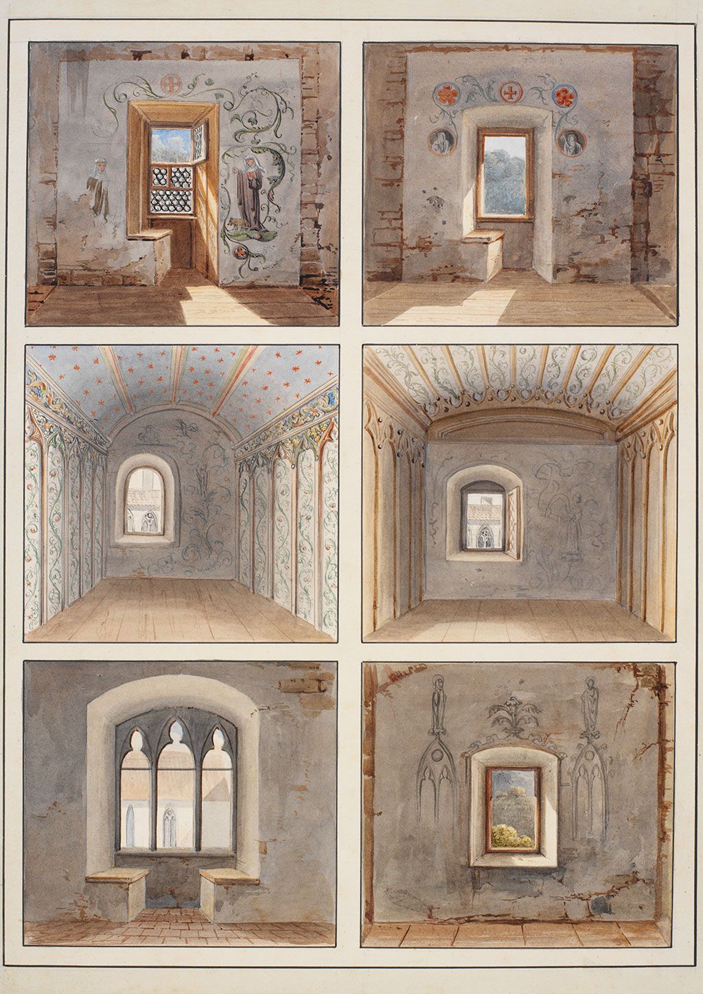 Sechs Ordensschwestern, ihre Herzen verschlossen in ihren Zellen, ihre Jungfräulichkeit und lebensfrohe Mädchenhaftigkeit gefangen im gläsernen Sarg. Dies ist eine Lesart, die vom sechsteiligen Holzrahmen als Oberkörper im starren Korsett ausgeht und Beklemmung auslöst. Geht man hingegen von der Reinheit des zarten Textils und den ansprechenden Interieurs im Innern der Aquarellquadrate aus, stellt man sich eher Frauen vor, die in ihrer Zeit das Glück hatten, ihren Geist bilden zu können, und die im geschützten Rahmen des Klosters ihren Mitmenschen seelischen Beistand leisteten.