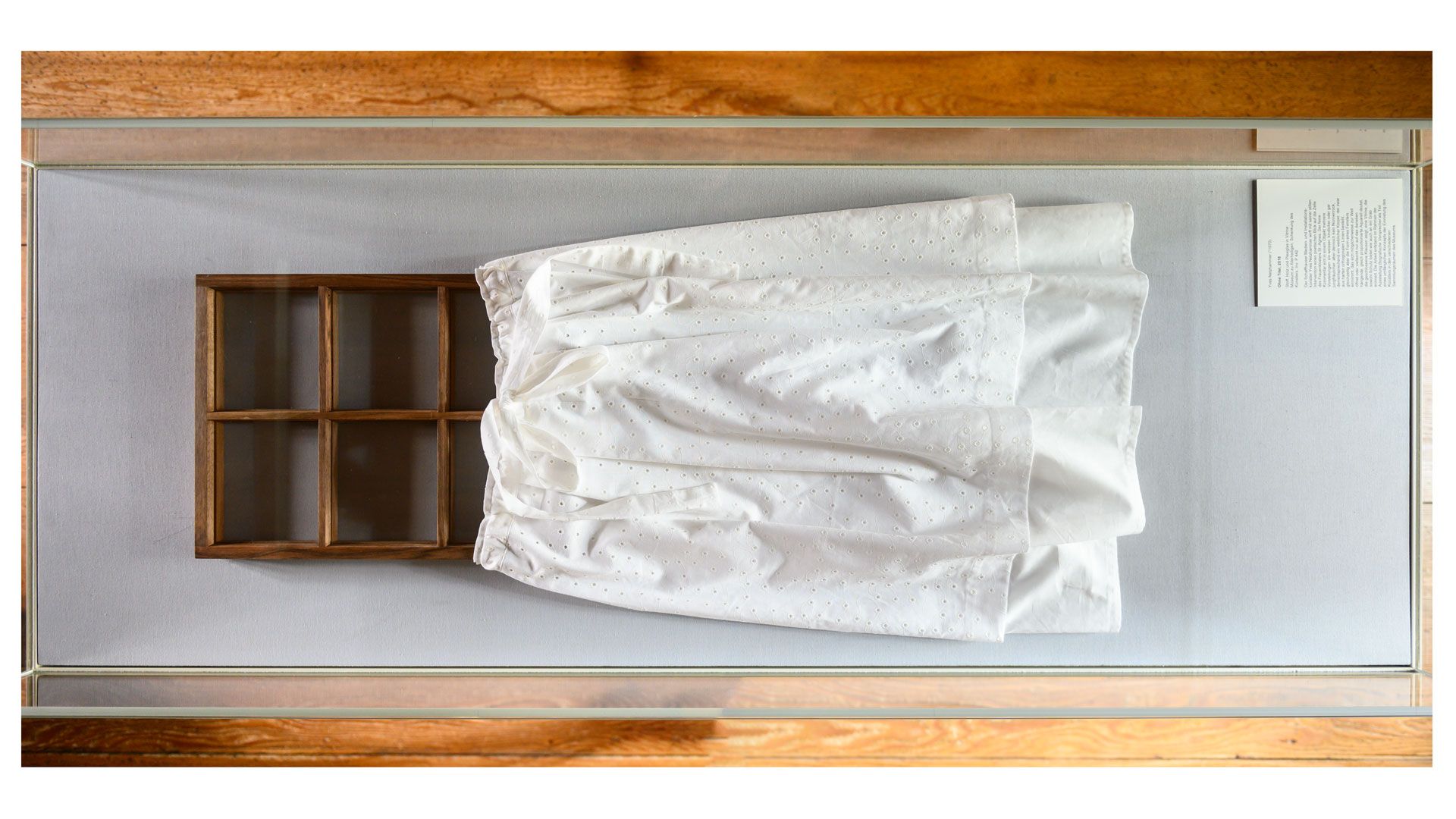 Ausgangspunkt ist ein rechteckiger, in sechs Quadrate unterteilter Holzrahmen, der den Massen des Aquarells entspricht. Diese an einen leeren Fensterrahmen erinnernde Konstruktion liegt in einer mit einer Plexiglashaube geschlossenen Vitrine. Der Rahmen wird an der kurzen Seite verlängert durch einen langen weissen Stoff, der als luftiger Rock mit loser Schleife einen imaginären Frauenkörper verhüllt.