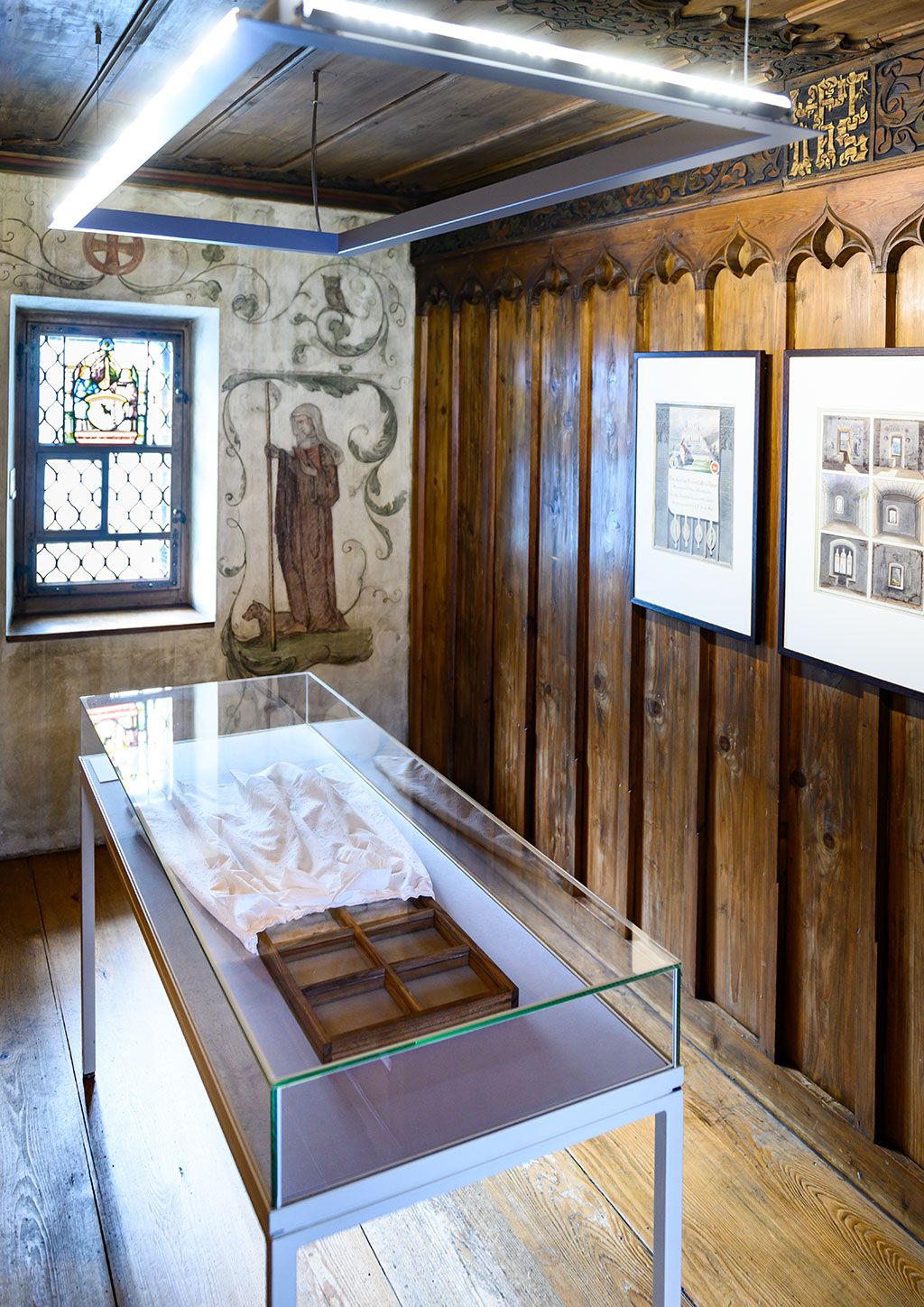 Wir befinden uns in einer spätgotischen Zelle des ehemaligen Benediktinerinnenklosters St. Agnes in Schaffhausen. Nach der Reformation wurde der Raum als Spitalzimmer genutzt. Es ist die einzige Zelle des im 11. Jahrhundert gegründeten Frauenklosters, die erhalten blieb und ins Museum zu Allerheiligen integriert wurde. An der Zellenwand hängt ein Aquarell des Malers Johann Jakob Beck aus dem frühen 19. Jahrhundert. Dieses zeigt die Ansicht der Zelle, in der wir uns befinden, sowie fünf weitere Zellen vor ihrem Abbruch 1824. Alle darauf abgebildeten Räume sind auffallend reich geschmückt, was den Status der oft adligen oder aus vornehmen Bürgerfamilien stammenden Nonnen veranschaulicht.
