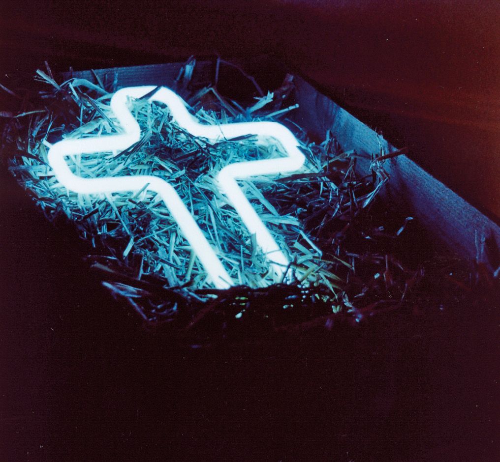 In einer Ausstellung moderner Kreuzesinterpretationen sprang mir diese Weinkiste ins Auge, gefüllt mit Stroh und einem blau leuchtenden Neonkreuz. Eine Kiste mit Stroh assoziiert der geneigte Betrachter in der Regel mit Jesu Geburt an Weihnachten. Und selbst Freidenkerinnen verbinden das Kreuzsymbol mit der Passion Jesu am Karfreitag und mit der Auferstehung an Ostern. Die 2005 entstandene Installation «Kreuz in der Krippe» der Genfer Künstlerin Aline Kundig verstört und fasziniert zugleich.