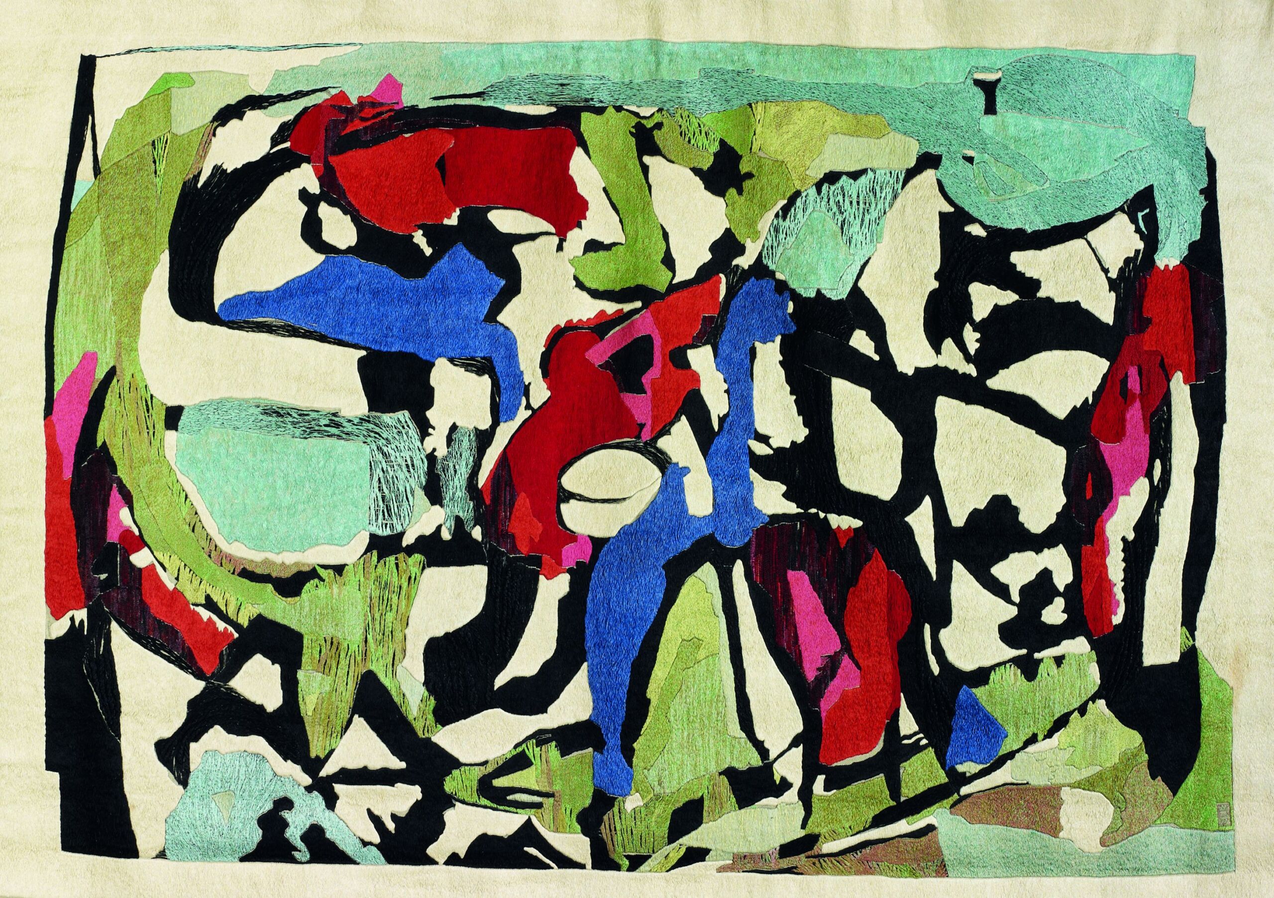 Die Künstlerin des Werkes, die 1909 in Berlin geborene Lissy Funk, unterrichtete wie ich ebenfalls an der Zürcher «Kunschti», sie ist also eine zeitversetzte Kollegin. Ihre Welten erschuf sie mit Nadel und Faden. Erst in ihren späten Jahren, da war sie bereits über 50, wandte sie sich dem Abstrakten zu. Davor zeigten ihre Wandteppiche idyllische Naturszenen mit spirituellem Einschlag, zum Beispiel einen Engel oder Szenen aus dem Leben Jesu. Letztere sind bis heute im Münster Allerheiligen in Schaffhausen zu sehen.