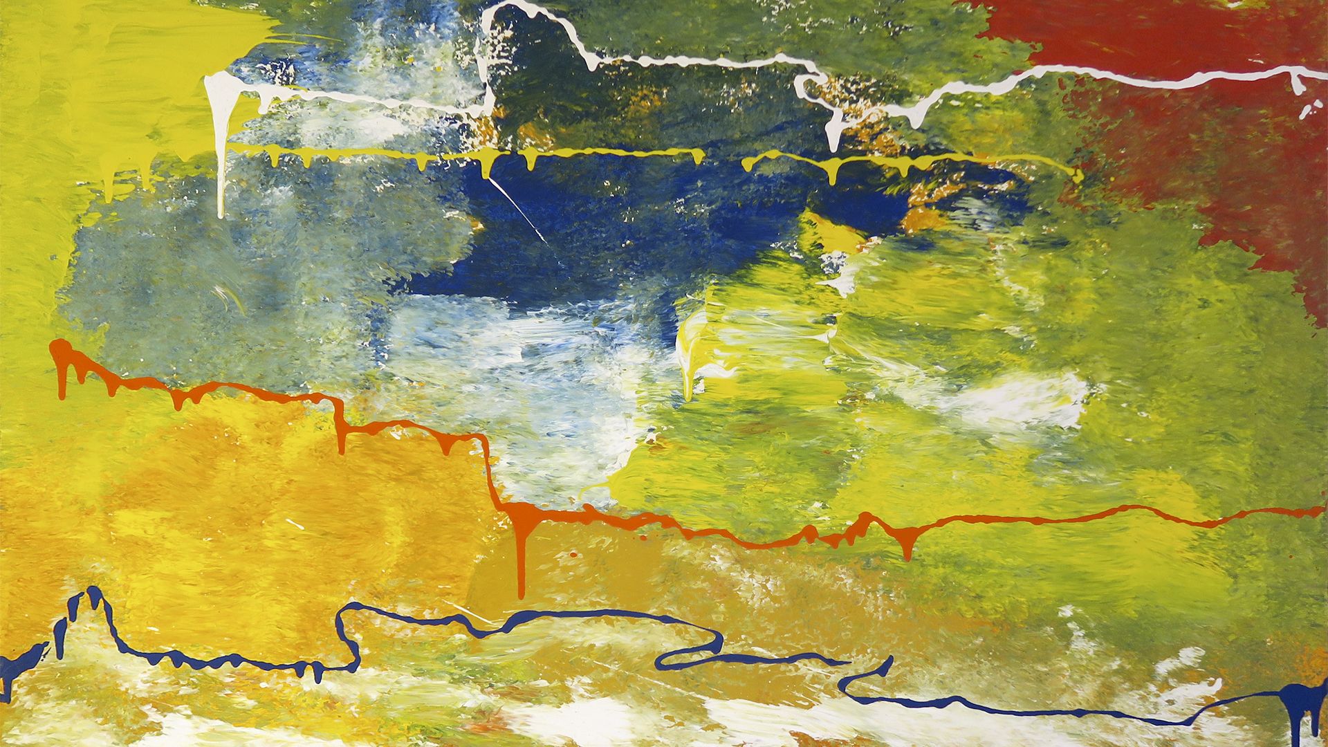 Eigentlich ist das Weiss an unseren Wänden für sie reserviert. Doch dann gibt es noch Platz für ein weiteres Bild ; schon viele Jahre hängt es bei uns in der Wohnung. Es ist ein farbenfrohes Gemälde. Die feinen und dick aufgetragenen Linien fallen auf. Manchmal beginnen sie verschwommen, ohne dass sie einen klaren Anfang nehmen. Nur eine blaue Linie zieht sich durch das gesamte Bild. Sie hat einen Anfang und ein Ende.
