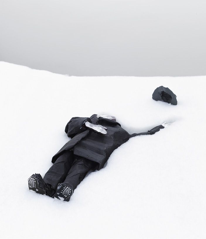 Die raumfüllende Skulptur stellt die Todesszene nach, durch die der scheue, im Tod derart exponierte Dichter zur Ikone wurde. Die behelfsmässig wirkende Ästhetik verleiht der Sterbesituation eine sperrige Grazie. Zugleich macht sie die Irritation erfahrbar, die vom Todesgeschehen ausgeht. So betont sie die Lücke zwischen der Leiche und den zu ihr hinführenden Fussspuren, die auf einer der Fotografien sichtbar ist.